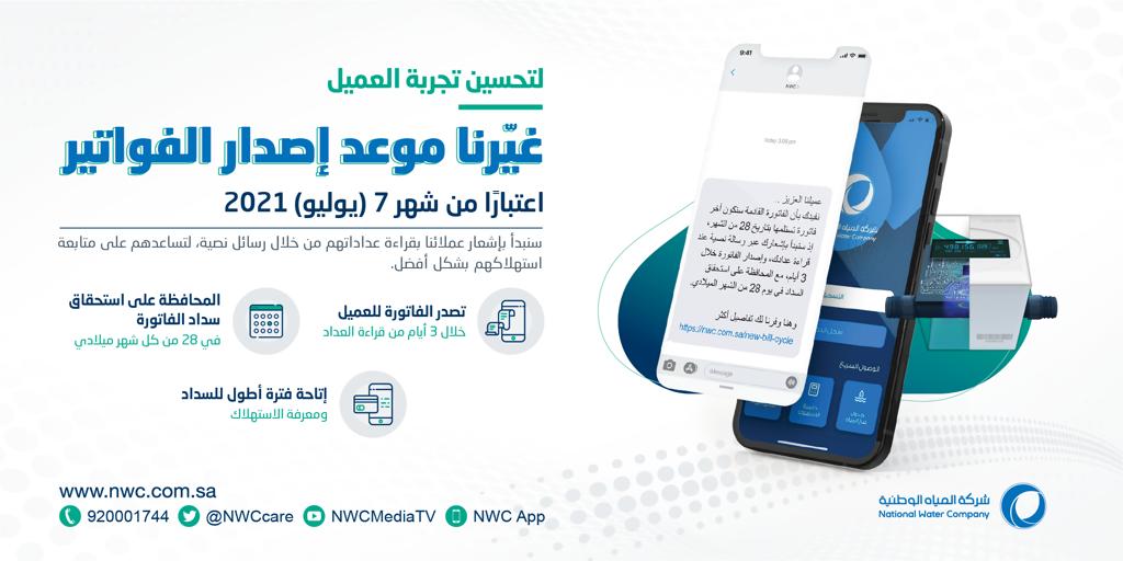 أعلنت شركة المياه الوطنية عن بدء إشعار العملاء بقراءات عداداتهم، بعد أخذها مباشرة من خلال إرسال رسائل نصية، وإصدار الفواتير خلال ثلاثة أيام من القراءة، من أجل تحسين تجربة العميل، مع المحافظة على استحقاق سداد الفواتير في يوم 28 من كل شهر ميلادي كما كان يتم في السابق.