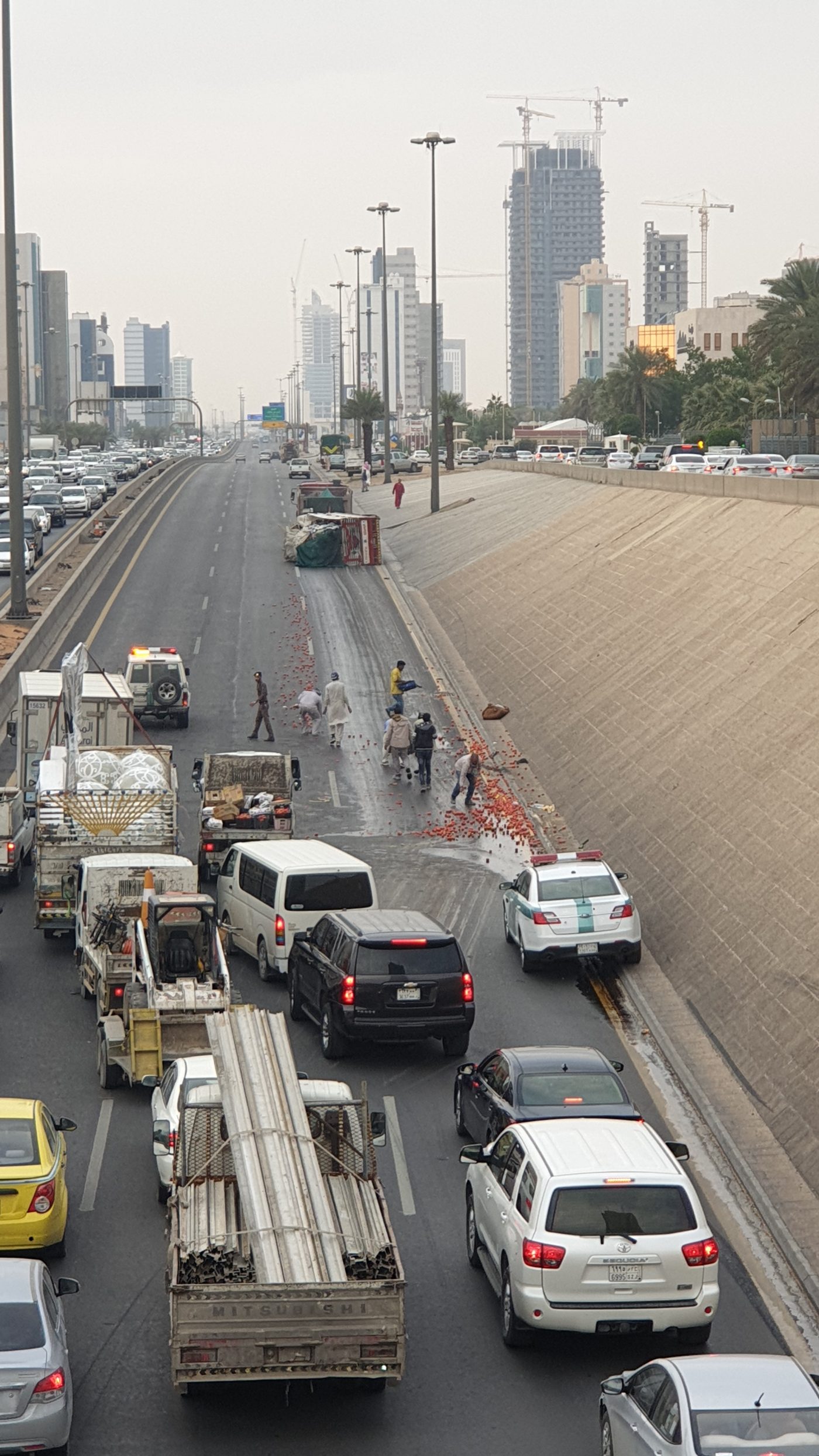 ادى انقلاب شاحنة “دينا” من الحجم المتوسط إلى تساقط شحنتها من الطماطم على أرضية الإسفلت في طريق الملك فهد في نفق الصحافة وتوقف الحركة المرورية باتجاه الشمال.