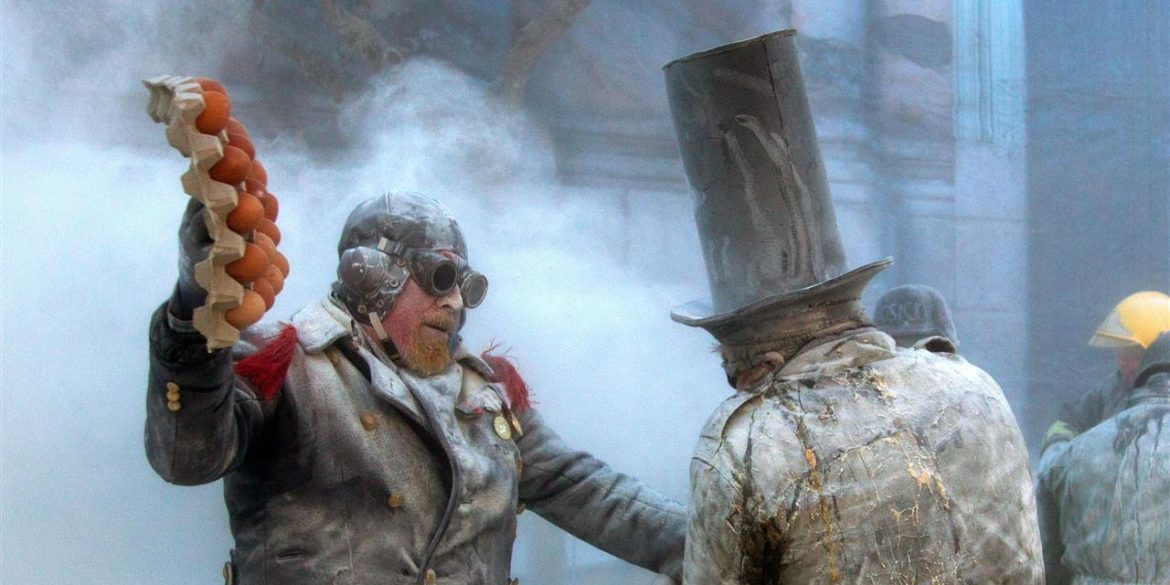 مهرجون يرتدون زيا عسكريا يشاركون في عرض لمعركة بمهرجان “ألس إنفاريناتس” بمدينة إيبي جنوب شرقي أسبانيا. في هذا المهرجان التقليدي، الذي يعود تاريخه لحوالي مائتي عام، يشارك مهرجون يرتدون الزي العسكري في تنفيذ “انقلاب وهمي”، مستخدمين البيض والدقيق والمرفقعات النارية، إحياء لما يعرف بيوم الأبرياء.