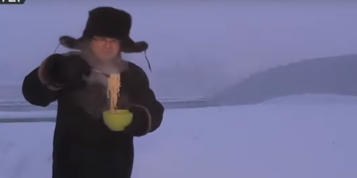 هل جربت أن تأكل المعكرونة في درجة 50 تحت الصفر؟ استعرض أحد سكان سيبيريا تأثير درجة الحرارة المنخفضة جدا على زبدية من الحساء الساخن، ففي غضون فترة قصيرة جدا تجمدت المعكرونة التي أخرجها من الزبدية ملتصقة بالشوكة. وفق ما نقله موقع روسيا اليوم.