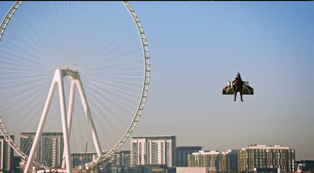 وارتدى ريفيه جناحا مصنوعا من ألياف الكربون مزودا بأربعة محركات نفاثة صغيرة، قادرة على الوصول إلى سرعة 400 كيلومتر في الساعة.