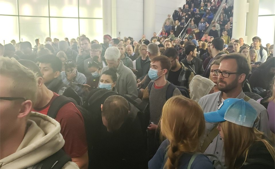 ونُشرت على منصة تويتر صورة التقطت في مطار أوهير الدولي في شيكاغو تظهر صالة مكتظة أشبه بمحطة لركاب المترو في ساعة الذروة في إحدى المدن الكبرى.