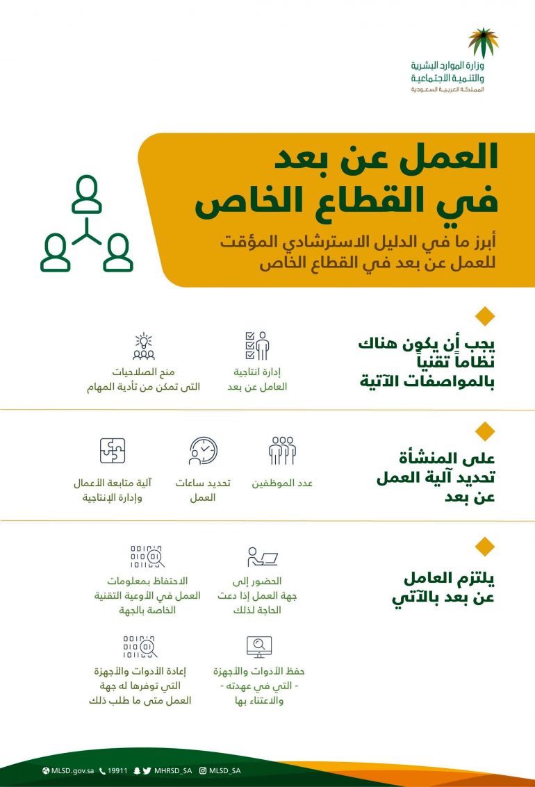 أصدرت وزارة الموارد البشرية والتنمية الاجتماعية الدليل الإرشادي المؤقت للعمل عن بُعد، ضمن جهود الدولة الحثيثة للسيطرة على فيروس كورونا المستجد (COVID19) ومنع دخوله وانتشاره، حيث وضح الدليل المصطلحات والمفاهيم والحقوق والواجبات على المنشآت والعاملين في القطاع الخاص.