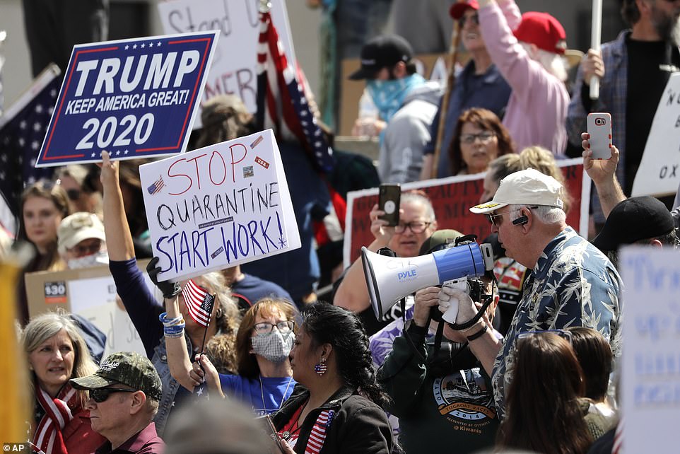 واستمرت الاحتجاجات ضد إغلاق الدولة لمكافحة تفشي الفيروس التاجي الجديد على الصعيد الوطني بعد ظهر أمس، حيث لا يزال ازدراء شديد للقيود التي أغلقت جزءًا كبيرًا من اقتصاد البلاد ينتشر ببطء عبر الولايات المتحدة.