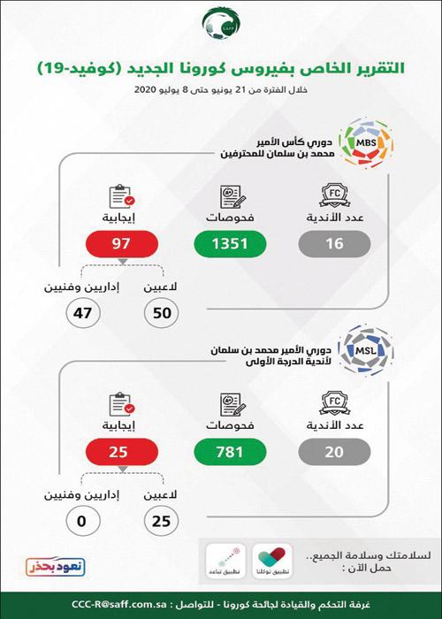 أعلن الاتحاد السعودي لكرة القدم، ثبوت إصابة 50 لاعباً من أندية الدوري السعودي للمحترفين، بفيروس كورونا المستجد. ونشر اتحاد اللعبة إحصائية للفترة بين 21 يونيو الماضي و8 يوليو الجاري، والتي أظهرت إصابة 50 لاعباً و47 إدارياً وفنياً من أندية الدوري البالغة 16 نادياً. وبلغ مجموع إصابات الأفراد في الدوري السعودي 97 مصاباً بالفيروس من أصل 1351 فحصاً مخبرياً. وبحسب الإحصائية فقد تم إجراء 781 فحصاً في أندية الدوري المحلي للدرجة الأولى والبالغ عددها 20 نادياً، حيث أظهرت إصابة 25 لاعباً بالفيروس التاجي، فيما خلت من أي حالة إيجابية للإداريين والفنيين. وأعلنت وزارة الرياضة السعودية سابقاً، عودة النشاط الرياضي يوم 21 يونيو الماضي، بعد توقف منذ شهر مارس الماضي، بسبب انتشار وباء فيروس «كوفيد – 19».