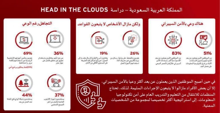 وشمل استطلاع Head in the Clouds آراء ما يقرب من 13200 موظف يعمل عن بُعد في 27 بلداً، بهدف الحصول على رؤى وإدراك أوسع عن النهج الذي يسلكونه تجاه الأمن السيبراني الخاص بالشركات وسياسات تكنولوجيا المعلومات. وكشفت نتائجه أن الشركات السعودية وجدت من الأوضاع الراهنة فرصة سانحة لرفع مستوى الوعي لدى الموظفين بأهمية الأمن السيبراني؛ معتبرة التحديات الحالية أفضل فرصة لتوعيتهم.