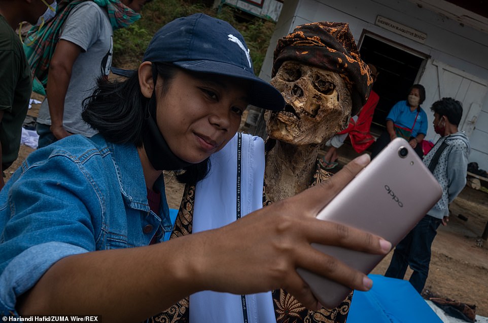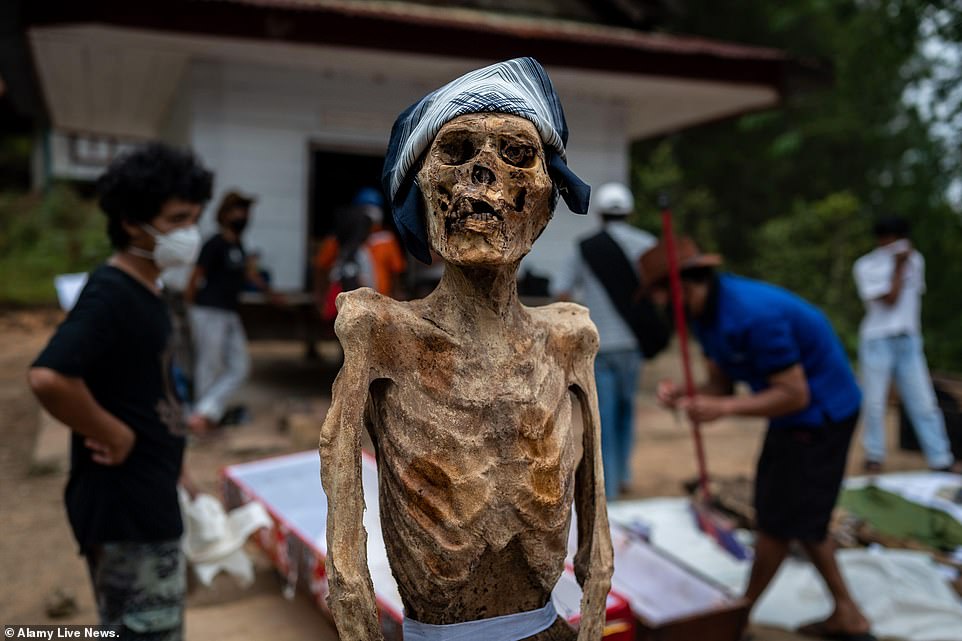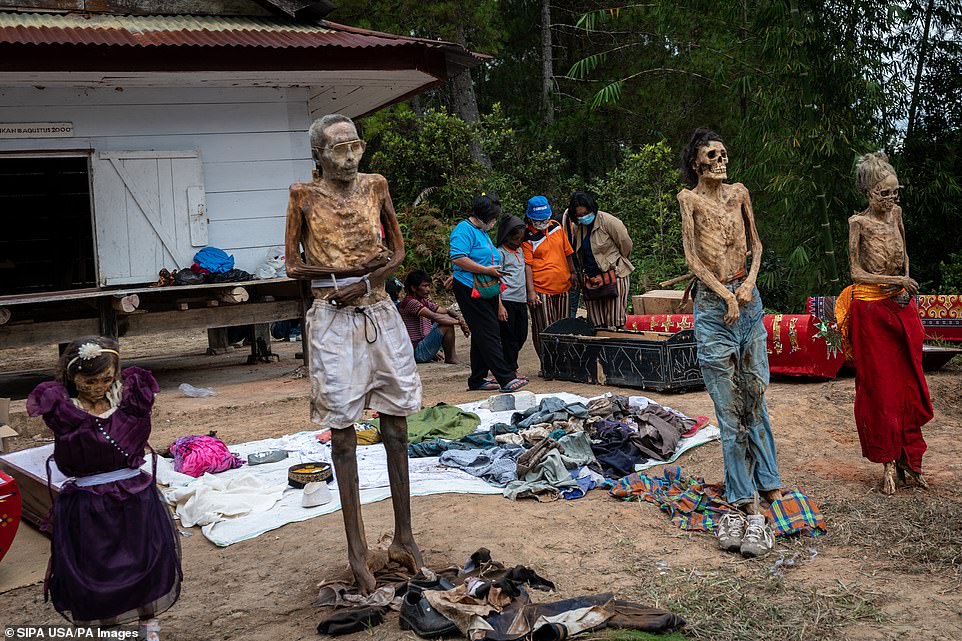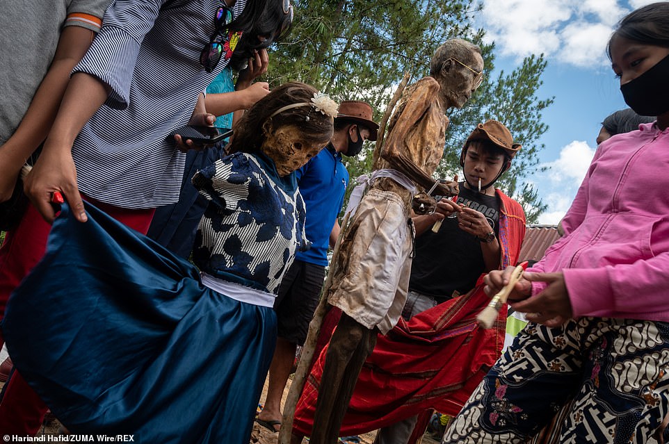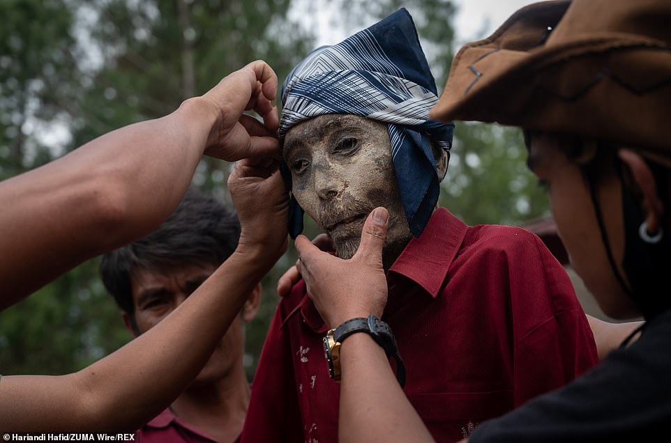اجتمعت عائلات حول أحبائهم الموتى بعد إخراجهم من قبورهم وتنظيف هياكلهم العظمية وإعادة تلبيسهم ملابسهم في طقس لتكريم أرواح أسلافهم المحنطين في إندونيسيا. وفق ما نقلته صحيفة الديلي ميل.