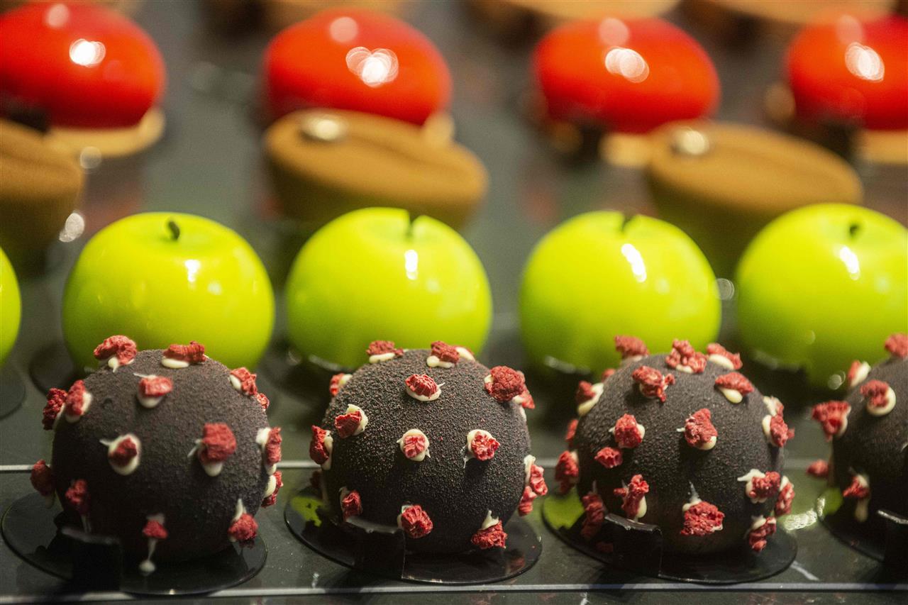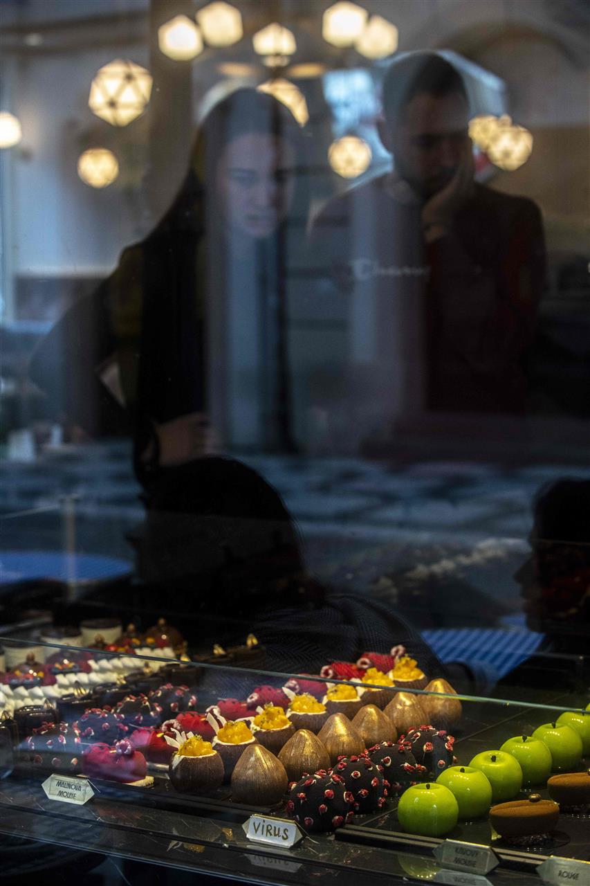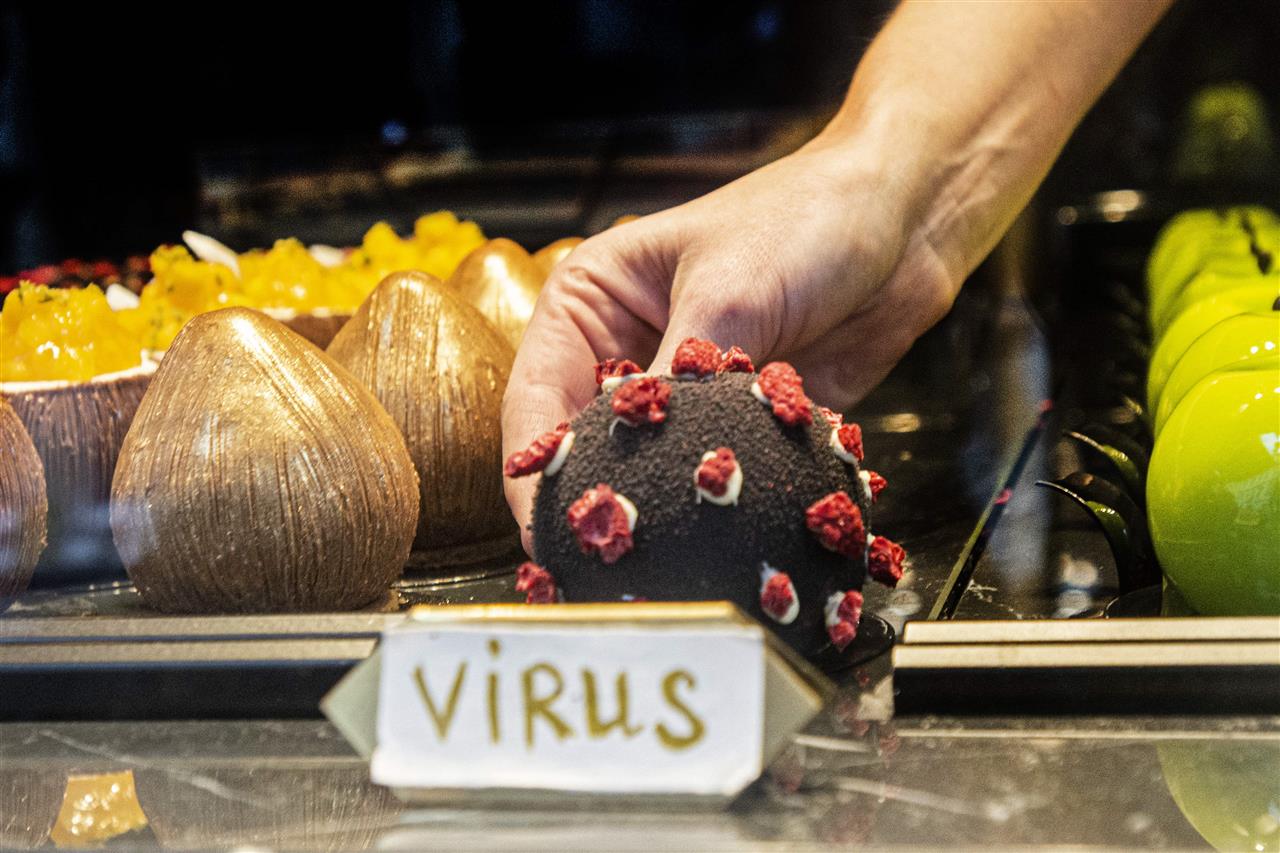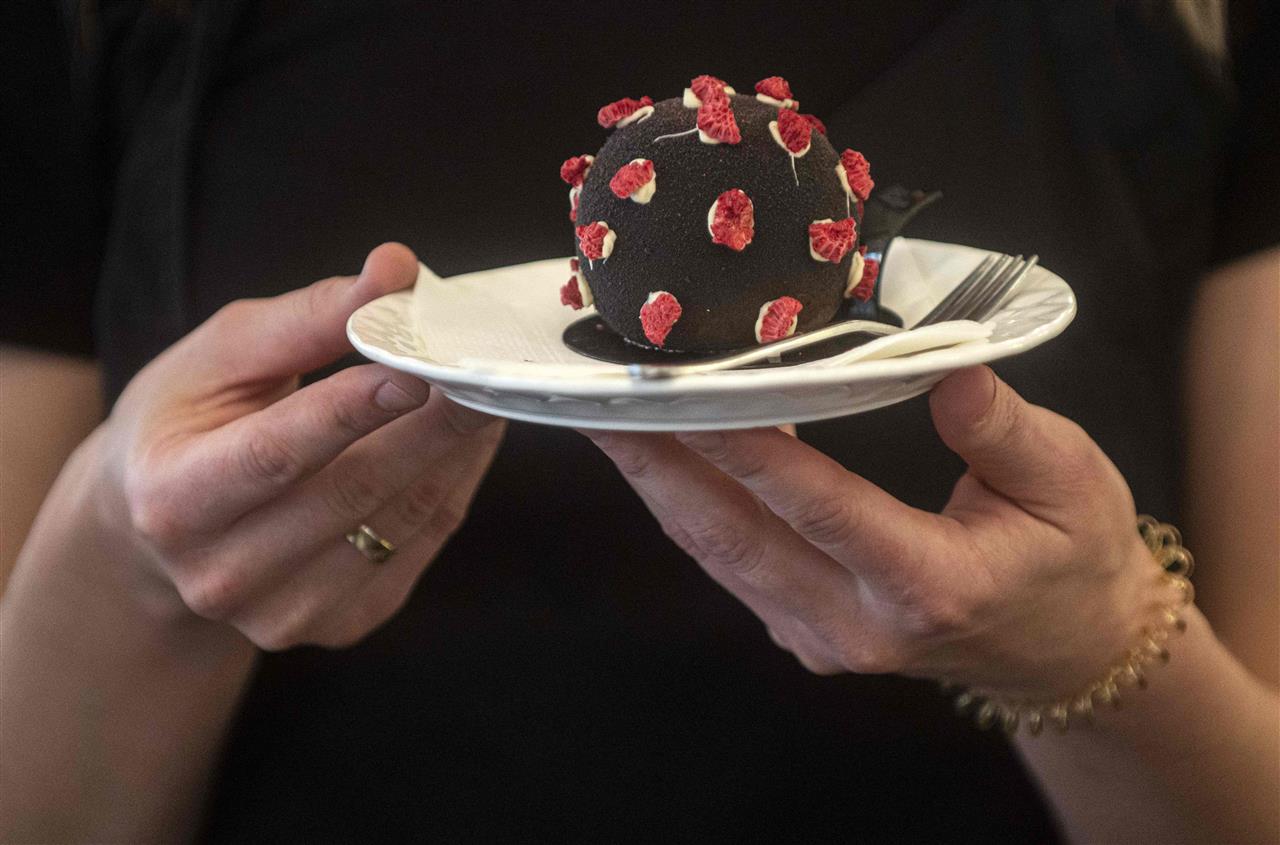 حلوى فيروس كورونا حلوى على شكل فيروس كورونا COVID-19 بأحد مقاهي براغ بجمهورية التشيك حيث أسوأ معدل لانتشار الفيروس في أوروبا.