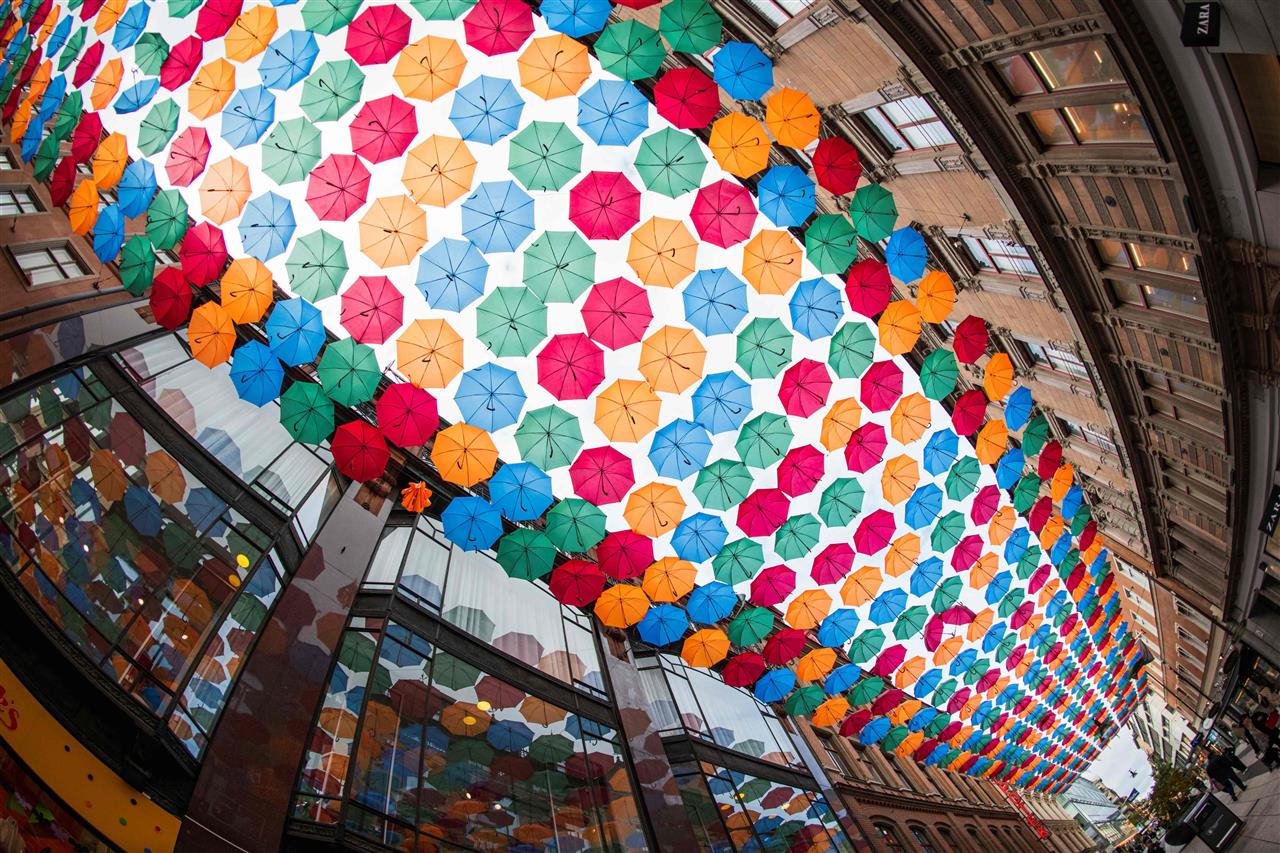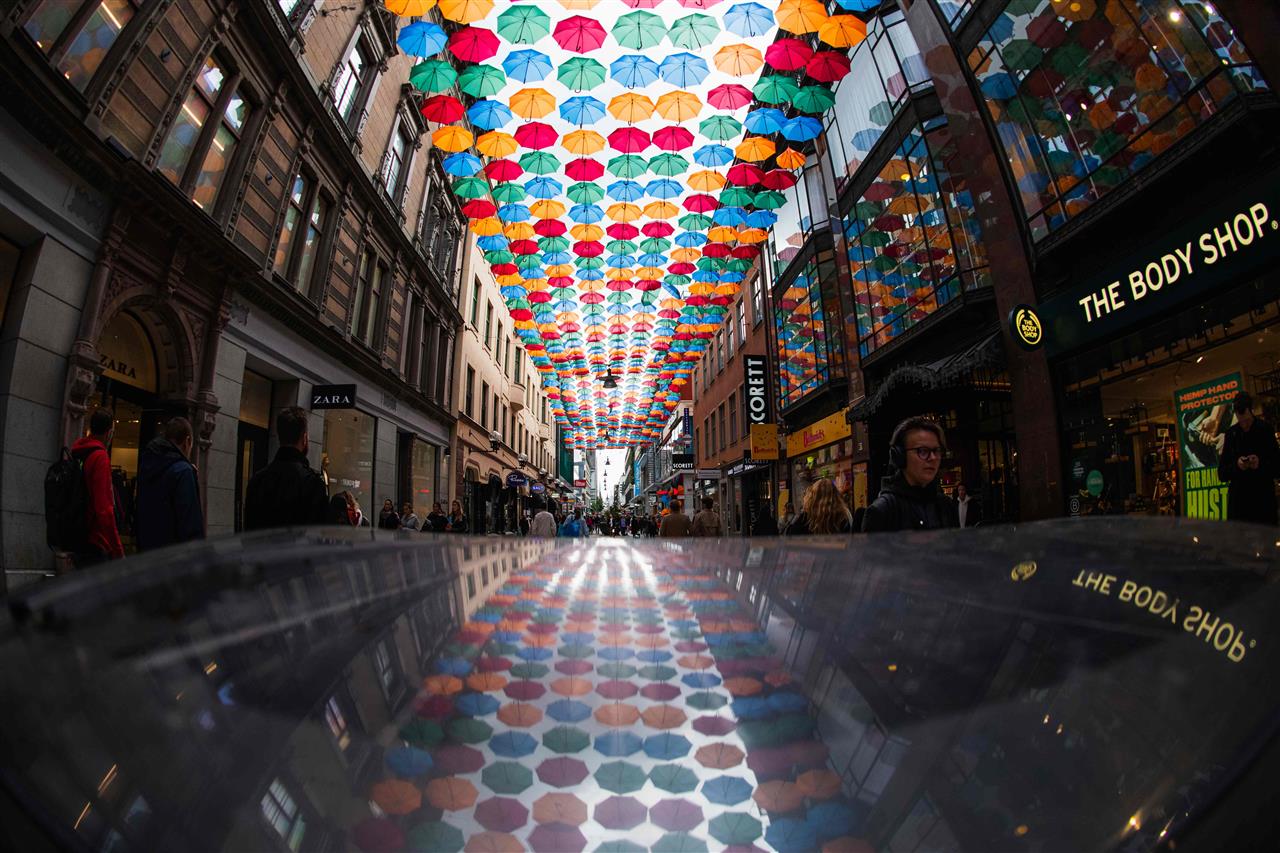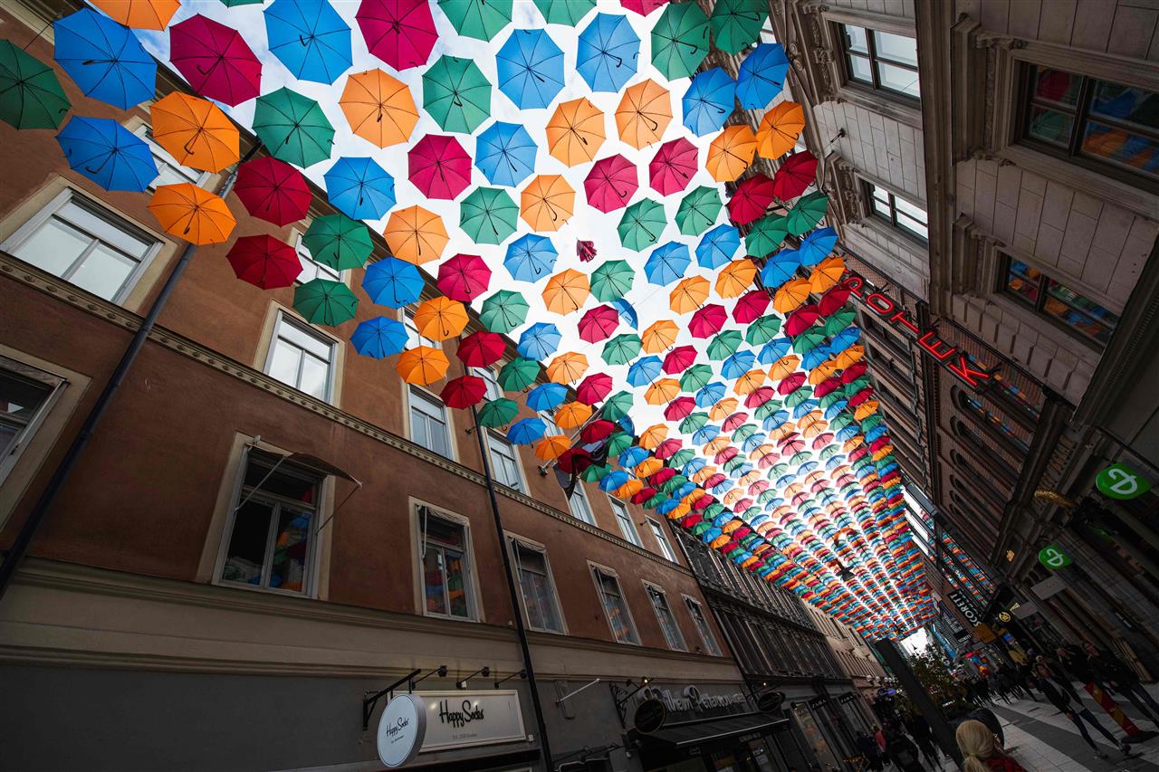 سقف من المظلات “مشروع المظلة”.. متسوقون يمشون في شارع تسوق وسط مدينة ستوكهولم، بعد تغطيته بالمظلات الملونة، المشروع الذي بدأه عام 2012 مجموعة تقودها فنانة برتغالية؛ لتغطية شوارع بمظلات ملونة بأشكال مختلفة في العديد من الأماكن في جميع أنحاء العالم.