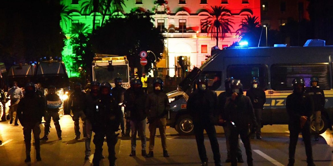 وخرجت تظاهرات تخللتها صدامات وأعمال عنف هذا الأسبوع في روما وميلانو ونابولي وتورينو ضد هذه التدابير كذلك. ومساء السبت، تحول تجمع في ساحة كامبو دي فيوري الشهيرة في روما إلى أعمال عنف عندما ألقى بعض المتظاهرين الزجاجات والمفرقعات النارية على الشرطة، التي قامت بتفريقهم مرتدية زي مكافحة الشغب. وانتهى التجمع الآخر في روما بنفس الطريقة. ويأتي ذلك غداة توقيف نحو عشرين شخصا خلال تظاهرة غير مصرح لها شارك فيها نحو مئتي شخص. وألقى بعض المتظاهرين زجاجات حارقة وقوارير وحجارة، وقلبوا حاويات القمامة وحطموا كاميرات مراقبة.