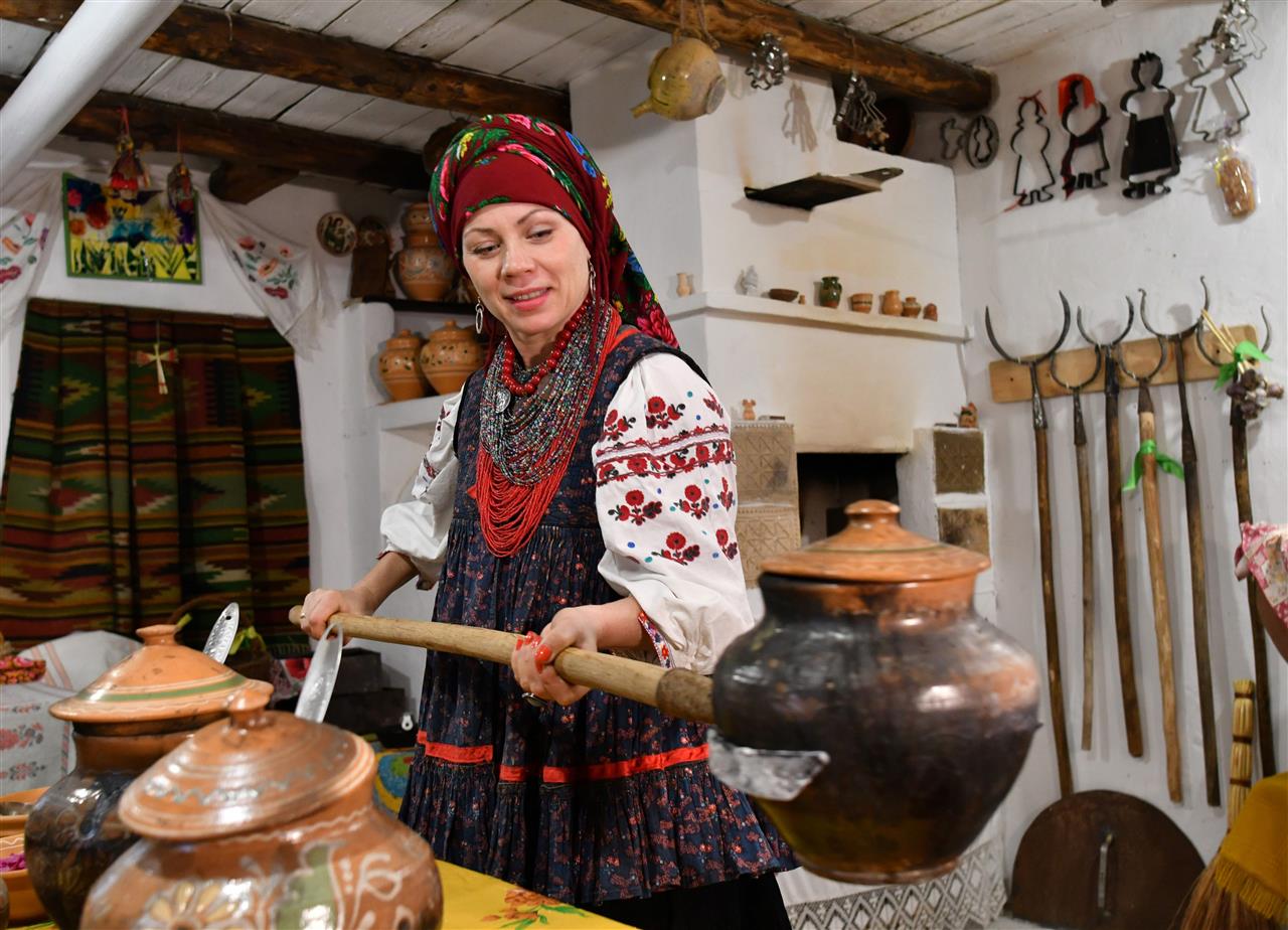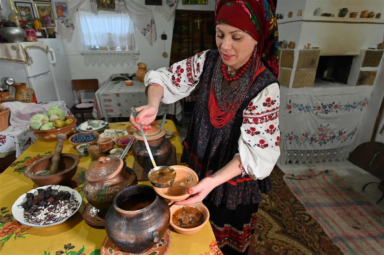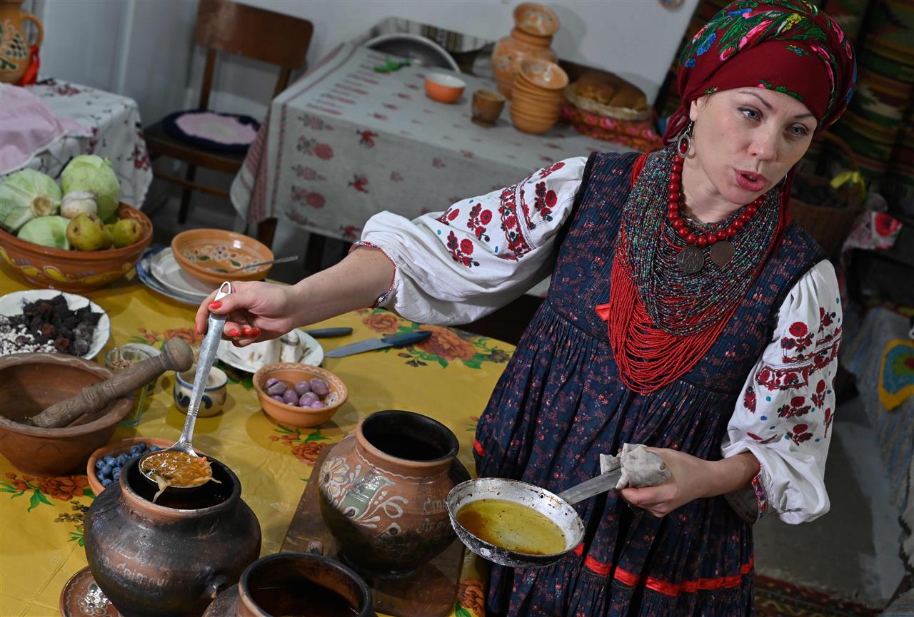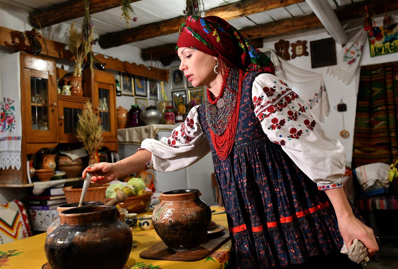 أولينا شيربان، عالمة الإثنوغرافيا والتاريخ الأوكراني، التي تدرس شوربة بورش الاوكرانية ولديها 365 من وصفاتها الفريدة من جميع أنحاء أوكرانيا ترتدي الملابس التقليدية الأوكرانية في مدينة OPISHNYA بمنطقة الاوكرانية، خلال اعدادها وصفات الطبق الشهير.