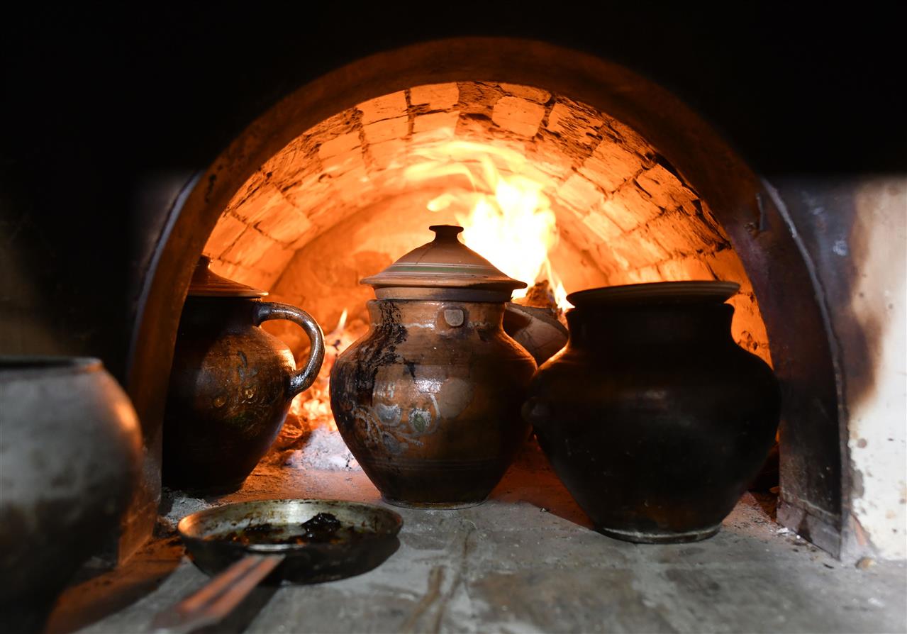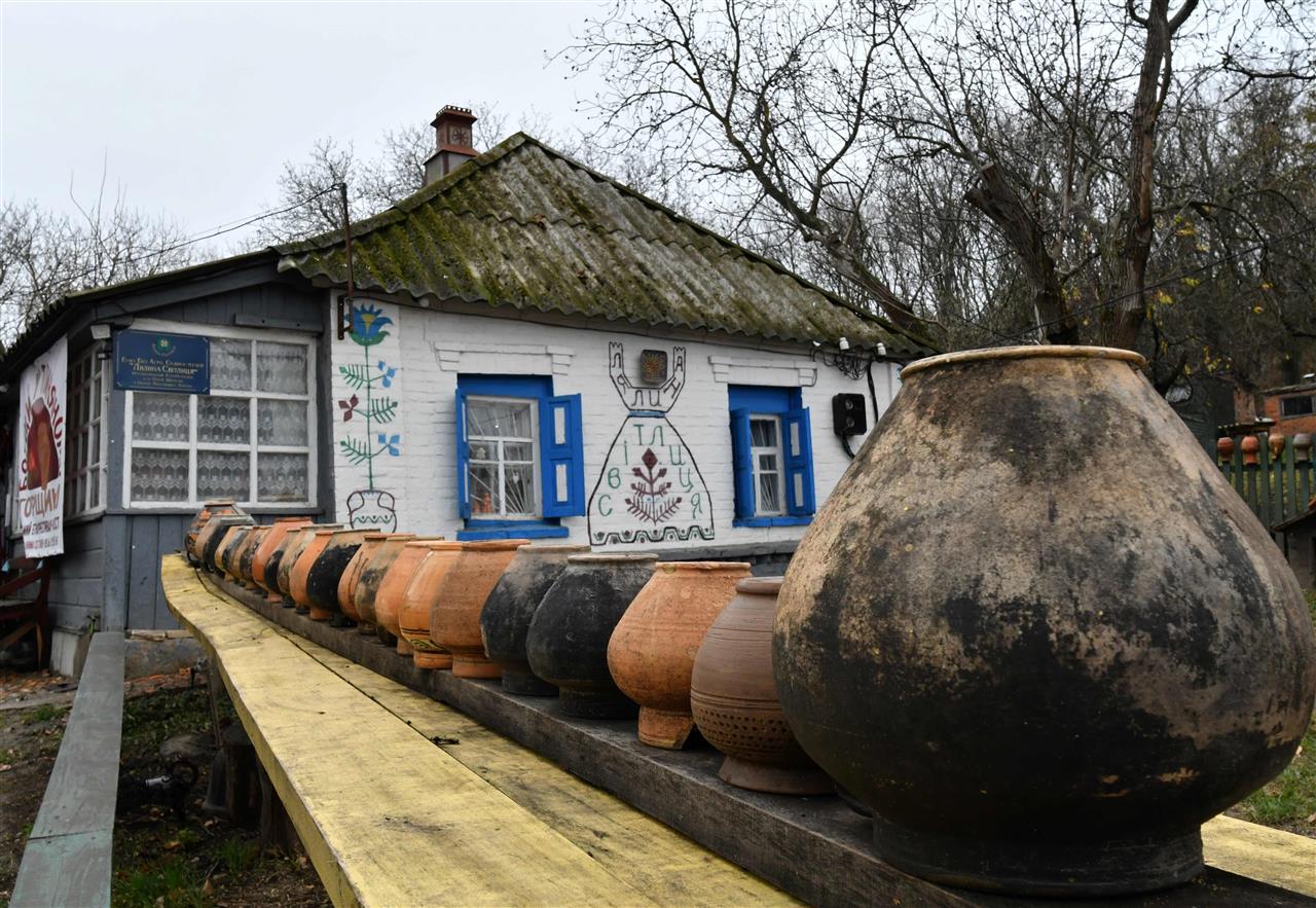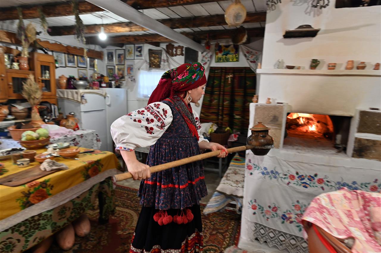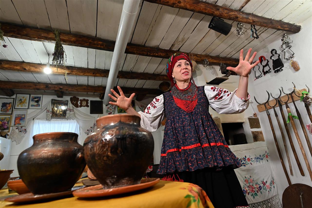 أولينا شيربان، عالمة الإثنوغرافيا والتاريخ الأوكراني، التي تدرس شوربة بورش الاوكرانية ولديها 365 من وصفاتها الفريدة من جميع أنحاء أوكرانيا ترتدي الملابس التقليدية الأوكرانية في مدينة OPISHNYA بمنطقة الاوكرانية، خلال اعدادها وصفات الطبق الشهير.