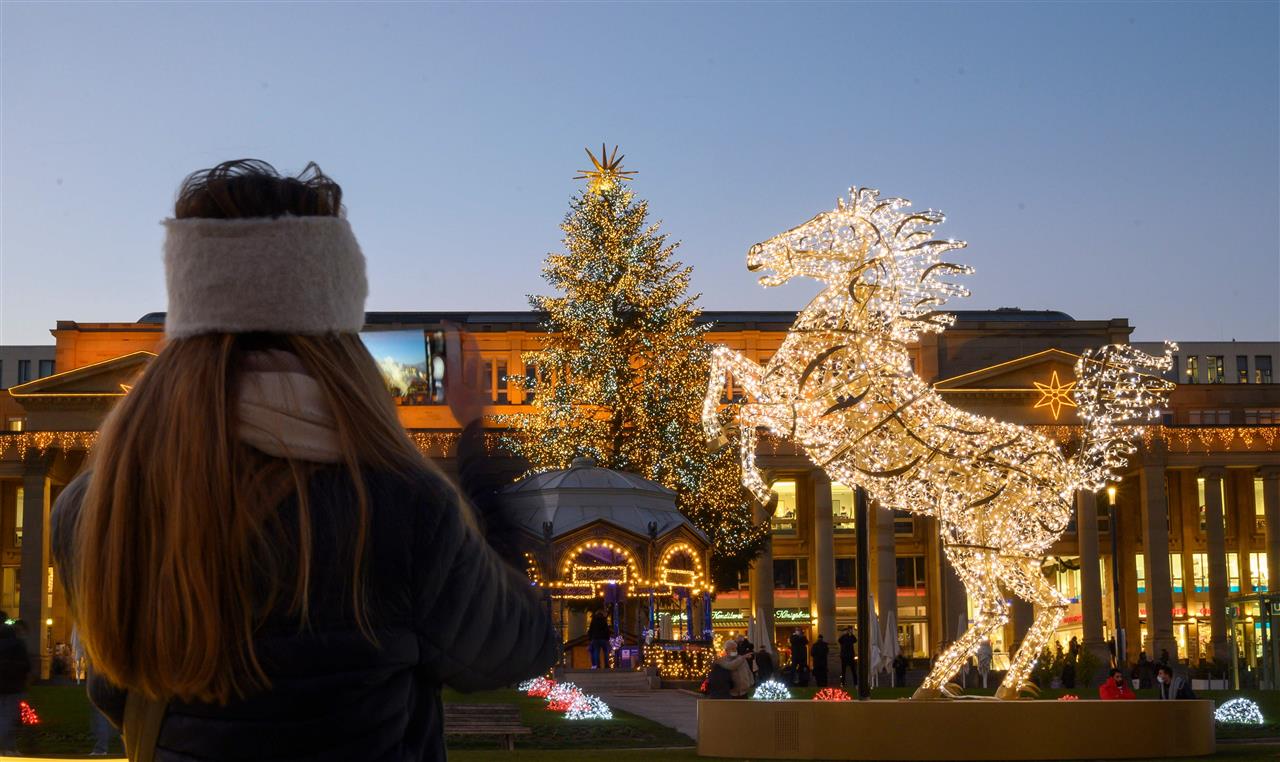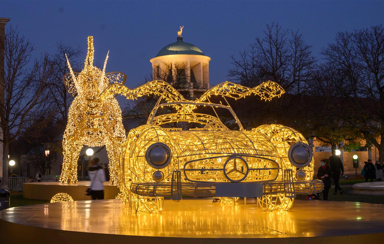 معرض للإبداع الضوئي مجسم ضوئي على شكل سيارة مرسيدس وآخر على هيئة فيل في معرض الأضواء المقام حاليا في ساحة القلعة بشتوتجارت في جنوب ألمانيا