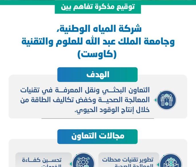 وقعت شركة المياه الوطنية، مع جامعة الملك عبد الله للعلوم والتقنية (كاوست) مؤخرًا، مذكرة تفاهم للتعاون ونقل المعرفة في برامج بحثية تشمل الموضوعات ذات الاهتمام المشترك بين الطرفين في مجالات تقنيات المعالجة الصحية.