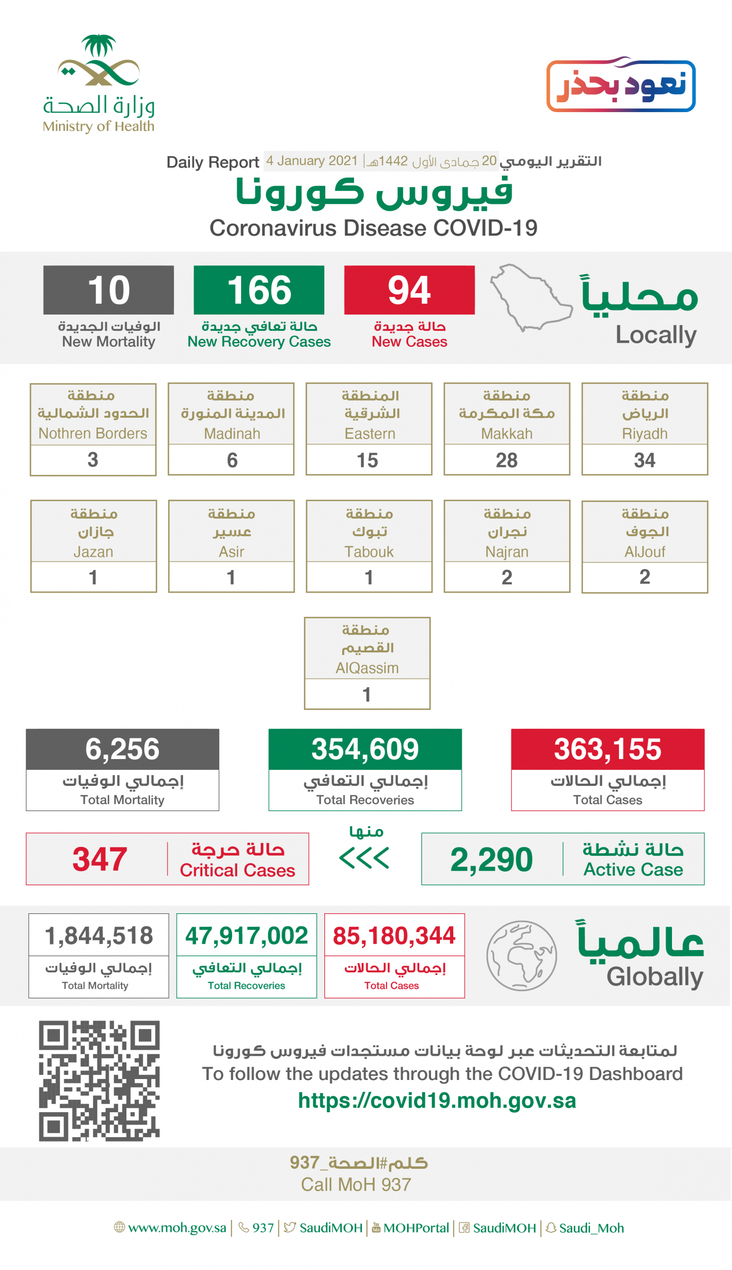 أعلنت وزارة الصحة اليوم الاثنين، تسجيل 94 حالة مؤكدة جديدة لفيروس كورونا الجديد (COVID –19) ليصبح عدد الحالات المؤكدة في المملكة 363155 حالة، من بينها 2290 حالة نشطة لا تزال تتلقى الرعاية الطبية، ومعظمهم حالتهم الصحية مطمئنة، منها 347 حالة حرجة، كما تم تسجيل 166 حالة تعافٍ جديدة، ليصل عدد المتعافين إلى 354609 حالات، وبلغ عدد الوفيات 6256 حالة، بإضافة 10 حالات وفاة جديدة.