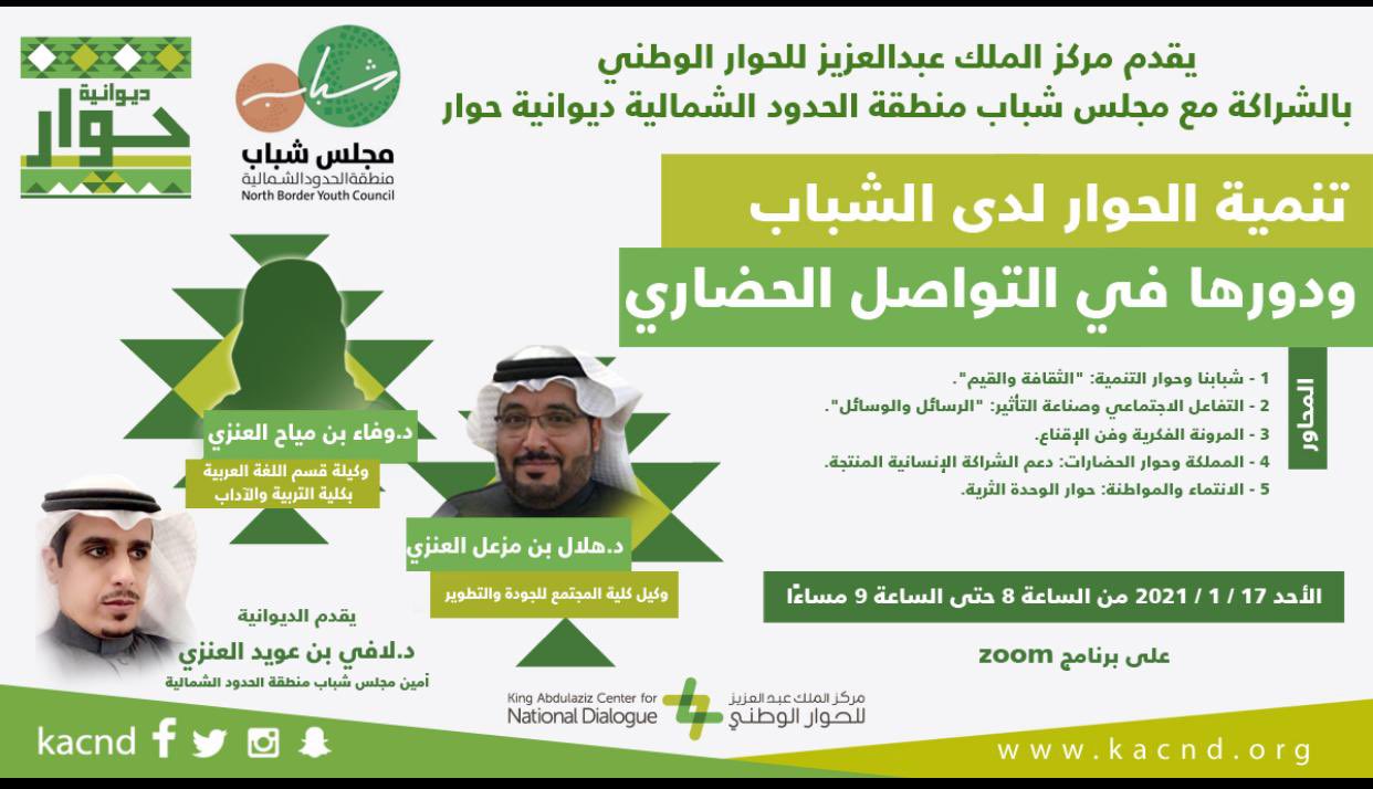 نفّذ مركز الملك عبد العزيز للحوار الوطني بالتعاون مع مجلس شباب منطقة الحدود الشمالية، أمس الأحد، لقاءً حوارياً عن بُعد بالمنطقة بعنوان: “تنمية الحوار لدى الشباب ودورها في تحقيق التواصل الحضاري”.
