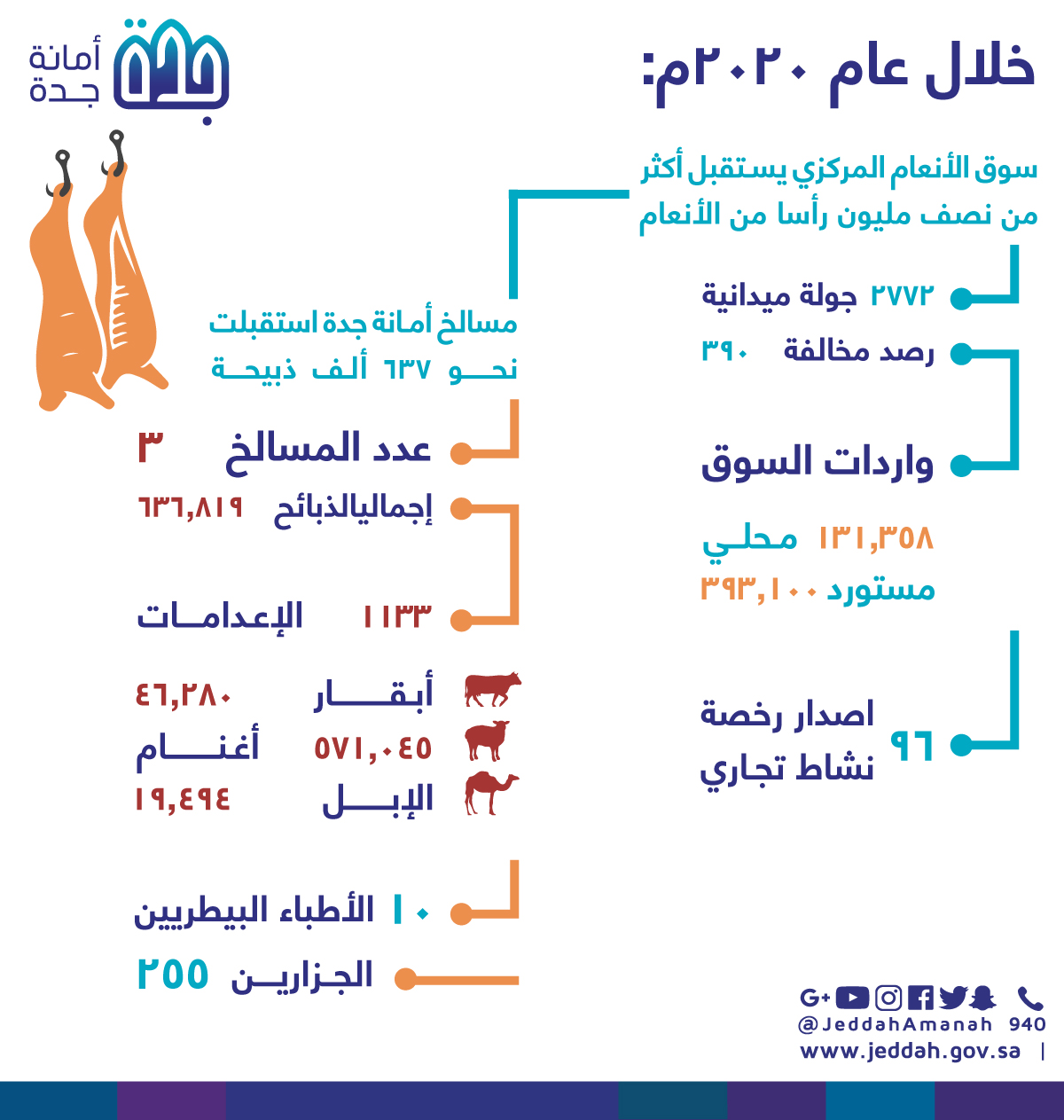 استقبل سوق الأنعام المركزي التابع لأمانة محافظة جدة 524.458 رأساً من الأنعام في عام 2020م بين إنتاج محلي ومستورد، فيما نفذت الأمانة خلال الفترة ذاتها 2772 جولة ميدانية أسفرت عن رصد 390 مخالفة.