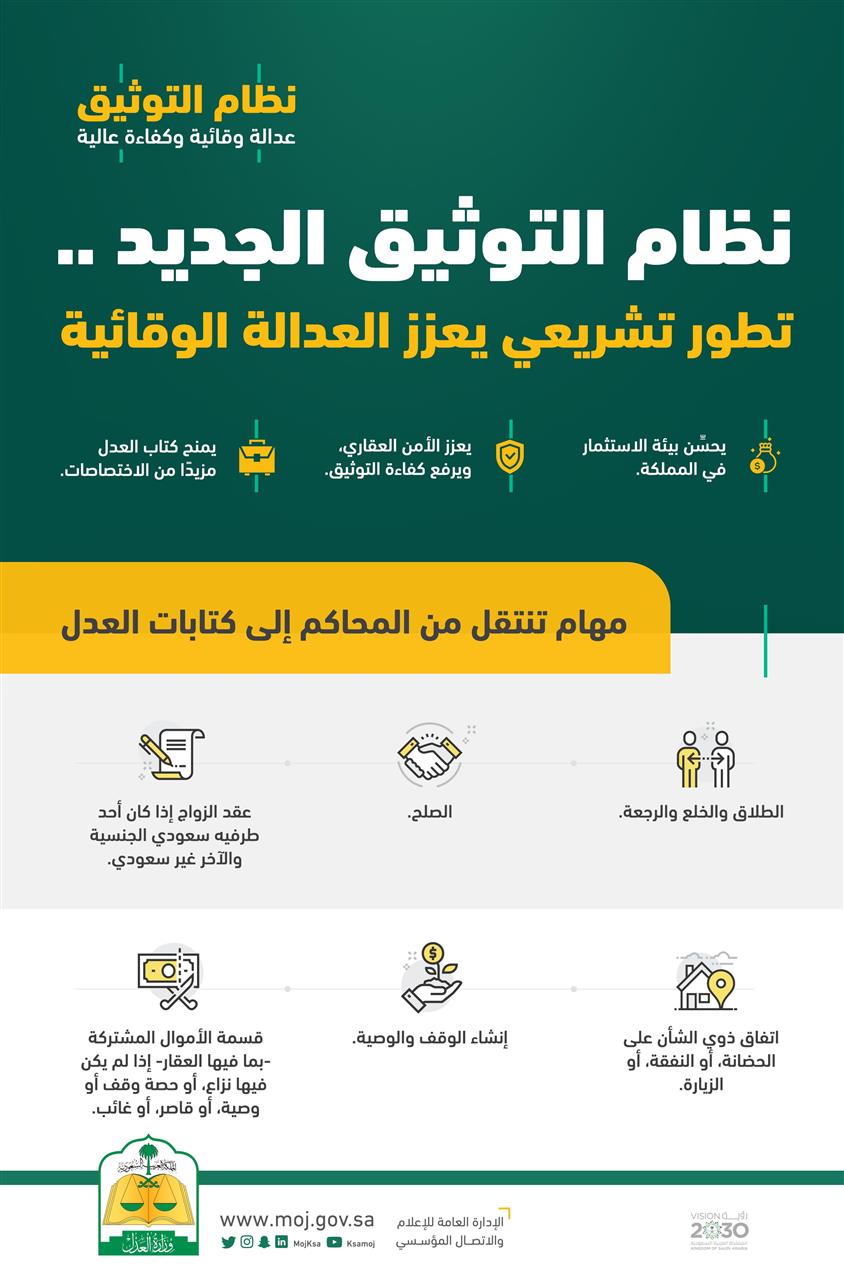 وتضمن نظام التوثيق نقل عددٍ من الاختصاصات المتصلة بالإقرارات التي لدى المحاكم إلى كتابات العدل، بما يسهم في تحسين تجربة المستفيد ورفع نسبة الرضا عن الخدمات التوثيقية من خلال تقديم خدمات عدلية توثيقية متكاملة ومؤتمتة تشمل جميع الأعمال الإدارية والمعلوماتية الداعمة لمنظومة التوثيق وتقديم الخدمات التوثيقية إلكترونيًا دون حاجة المستفيدين لزيارة المرافق العدلية، إضافة إلى تحفيز النمو الاقتصادي من خلال بناء منصات خدمات نوعية، وتعزيز الأمن العقاري ورفع مستويات الشراكة مع القطاع الخاص، ورفع تصنيف المملكة في مؤشر تسجيل الملكية.