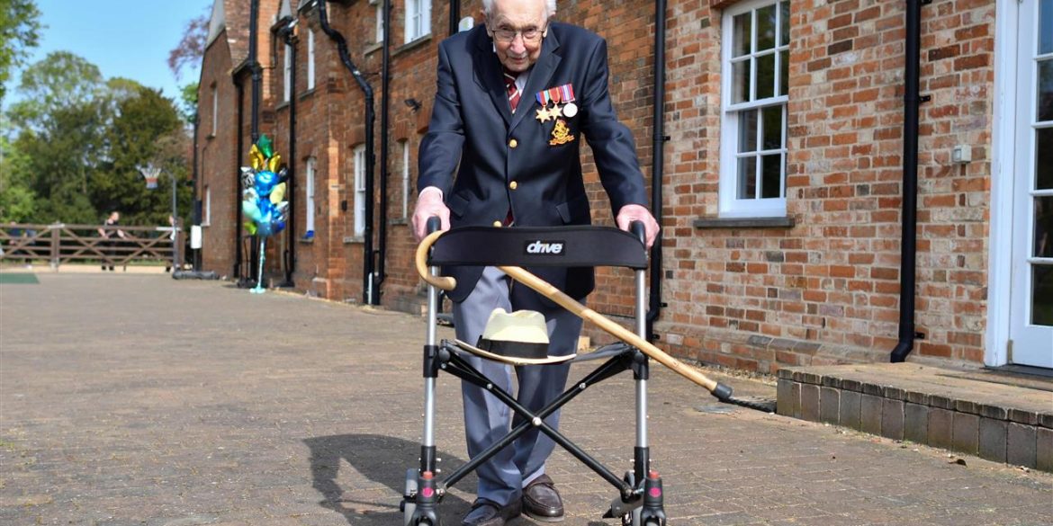 وجاء جزء من التبرعات بعد اعلانه انه سيلف حديقته سيرا بمساعدة عكاز لمئة مرة قبل عيد ميلاده المئة في 30 أبريل 2020، وحينها تم منحه رتبه كولونيل فخرية. بعدها سجل “لن تمشي وحدك”، وهي أغنية أميركية تعد بمثابة نشيد لنادي ليفربول، فاحتلت المراتب الأولى في لوائح الأغاني الأكثر انتشاراً في بريطانيا.