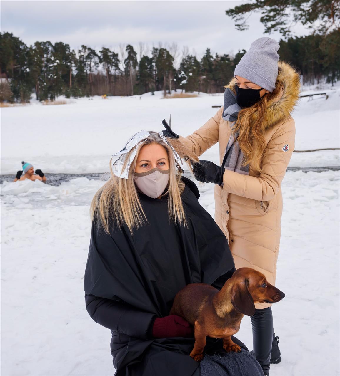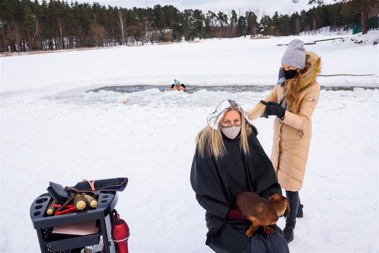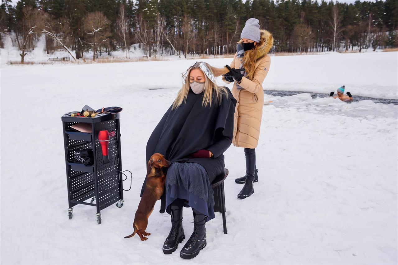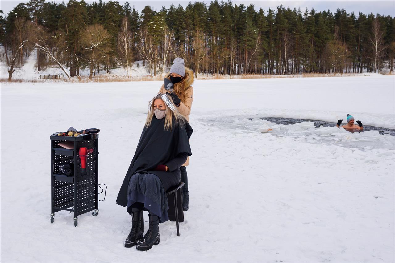 تصفيف الشعر على بحيرة متجمدة مصففة شعر تعمل في الهواء الطلق على بحيرة متجمدة في لاتفيا بينما أغلقت محلات مصففي الشعر ضمن الإجراءات الاحترازية لمنع تفشي كورونا