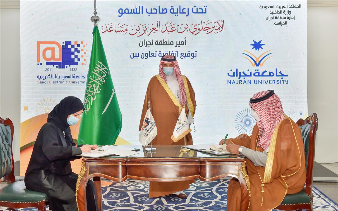 من جهة أخرى، رعى صاحب السمو الأمير جلوي بن عبدالعزيز بن مساعد أمير منطقة نجران اليوم، توقيع مذكرة تفاهم بين جامعة نجران والجامعة السعودية الإلكترونية، تهدف إلى تأطير مشاريع ومبادرات التعاون بين الجامعتين وتوظيف إمكانياتهما وخبراتهما بما يحقق المصلحة المشتركة للطرفين؛ خصوصاً في المجال العلمي والتعليمي والتدريبي والتطوير المهني والثقافي والتقني وعدد من المجالات الأخرى.
