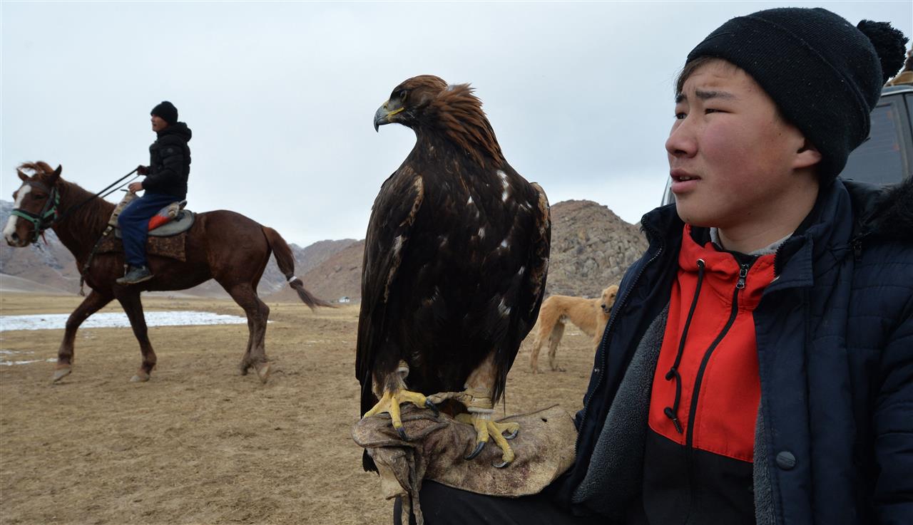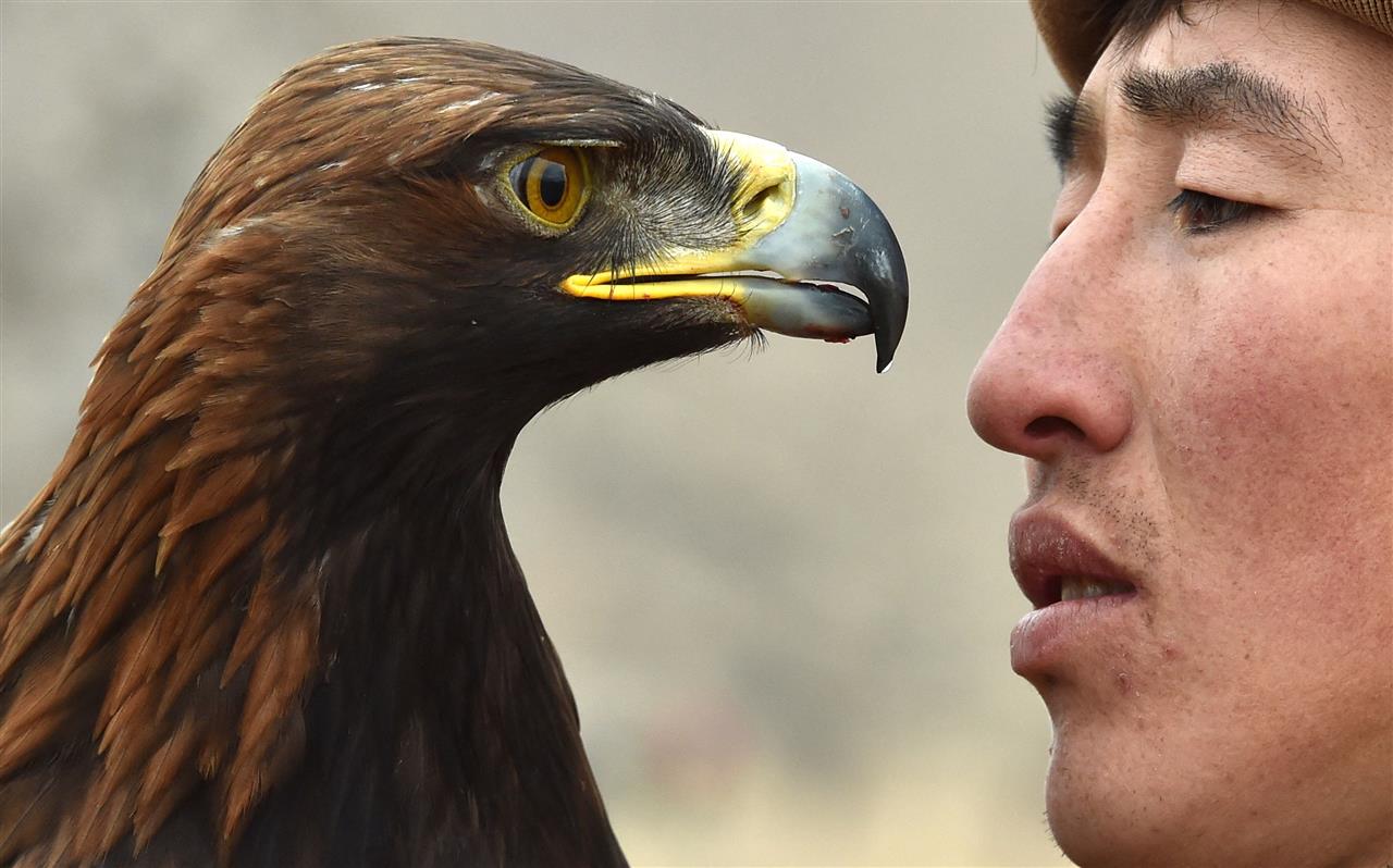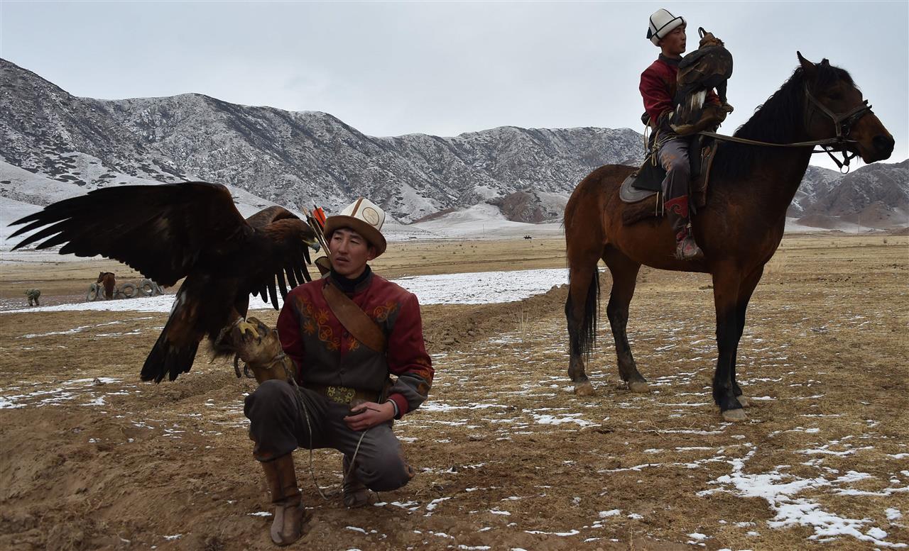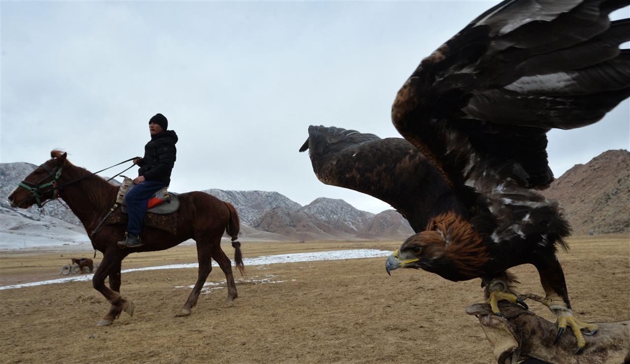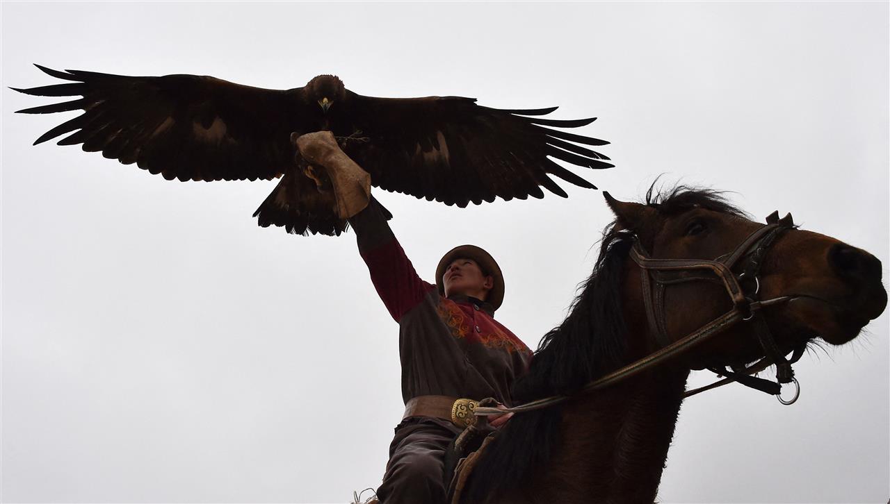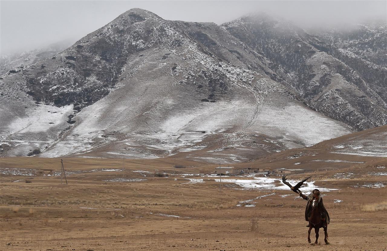 شراسة النسر الذهبي نسر ذهبي يفترس حيوان إبن آوي خلال مهرجان الصيد السنوي في قرية تورا-سو ، بالقرب من بحيرة إيسيك كولي ، على بعد 280 كيلومترًا من بيشكيك عاصمة قرغيزستان في وسط آسيا. ويتضمن المهرجان بالإضافة إلى الصيد بالنسور الذهبية، الصيد بالصقور والرماية.