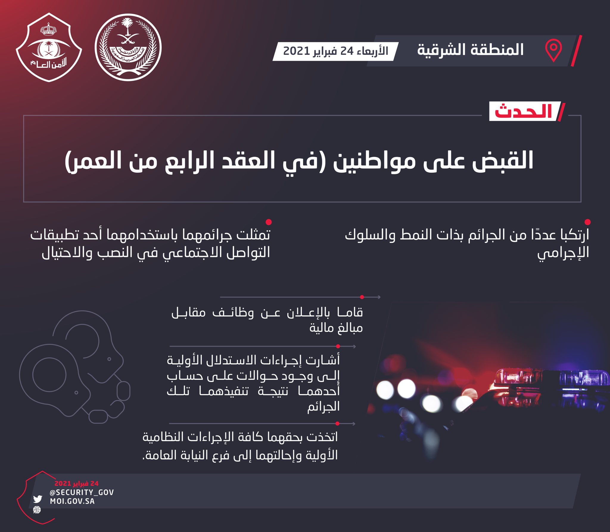 وأفاد المتحدث الإعلامي لشرطة المنطقة الشرقية المقدم محمد الشهري، بأن نتائج المتابعة الأمنية لجرائم الاعتداء على الأموال وجرائم المعلوماتية، أسفرت عن القبض على مواطنين في العقد الرابع من العمر، ارتكبا عددًا من الجرائم بذات النمط والسلوك الإجرامي، تمثلت في استخدامهما أحد تطبيقات التواصل الاجتماعي في النصب والاحتيال بالإعلان عن وظائف مقابل مبالغ مالية، حيث أشارت إجراءات الاستدلال الأولية إلى وجود حوالات على حساب أحدهما نتيجة تنفيذهما تلك الجرائم