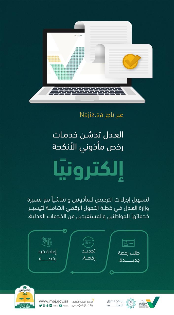 دشنت وزارة العدل ممثلة في الإدارة العامة لمأذوني الأنكحة، خدمات إصدار رخص مأذوني الأنكحة إلكترونيًا عبر منصة “ناجز” najiz.sa ممثلة بطلب رخصة جديدة، وتجديد رخصة، وإعادة قيد رخصة، لتسهل إجراءات الترخيص للمأذونين.