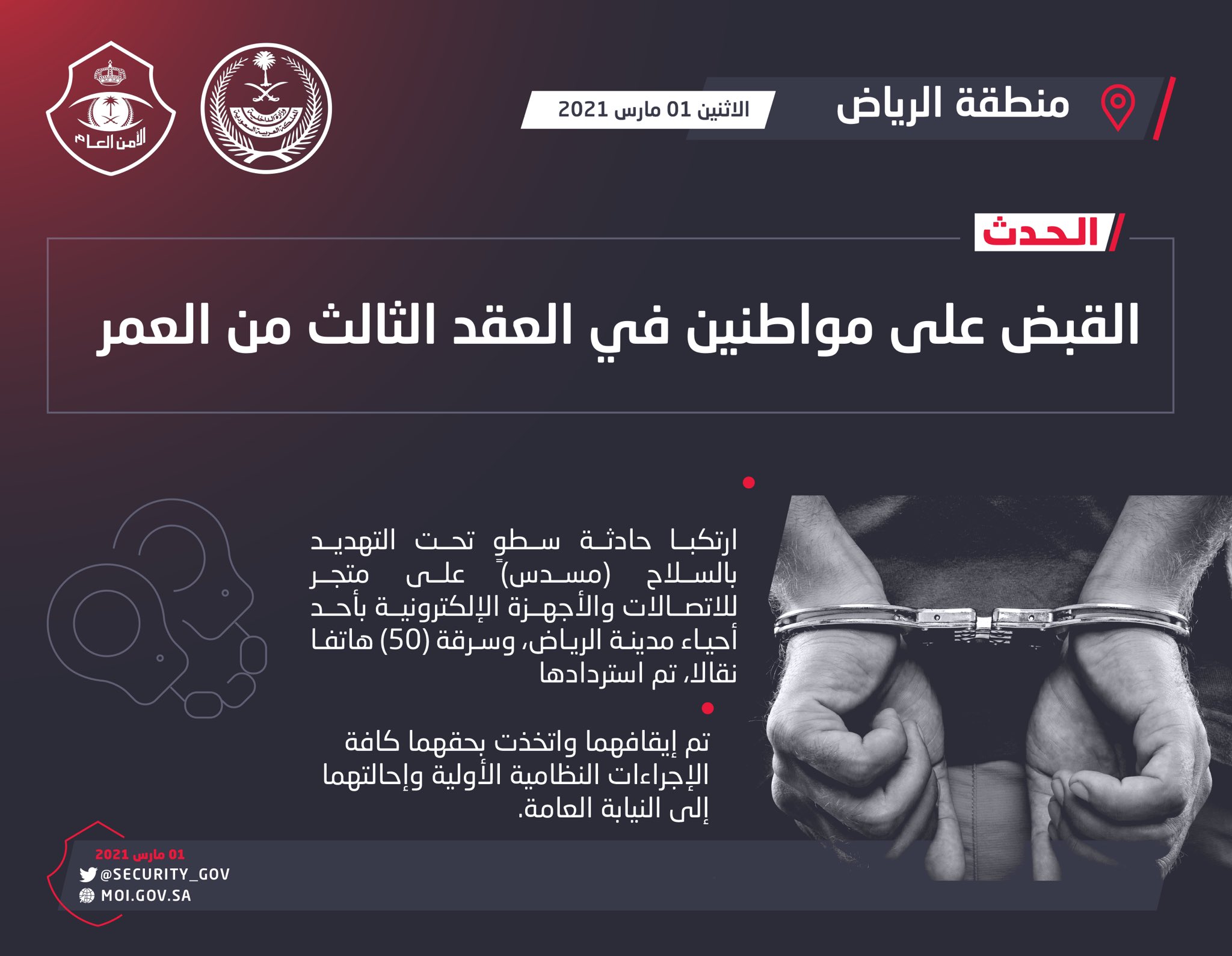 وأفاد المُتحدث الإعلامي لشرطة منطقة الرياض الرائد خالد الكريديس، بأن المتابعة الأمنية لمكافحة جرائم الاعتداء على الأموال وتعقب مرتكبيها، أسفرت عن تمكن الجهة المختصة بشرطة المنطقة من القبض على مواطنين في العقد الثالث من العمر، ارتكبا حادثة سطوٍ تحت التهديد بالسلاح “مسدس” على متجر للاتصالات والأجهزة الإلكترونية بأحد أحياء مدينة الرياض، وسرقة “50” هاتفاً نقالاً، تم استردادها.