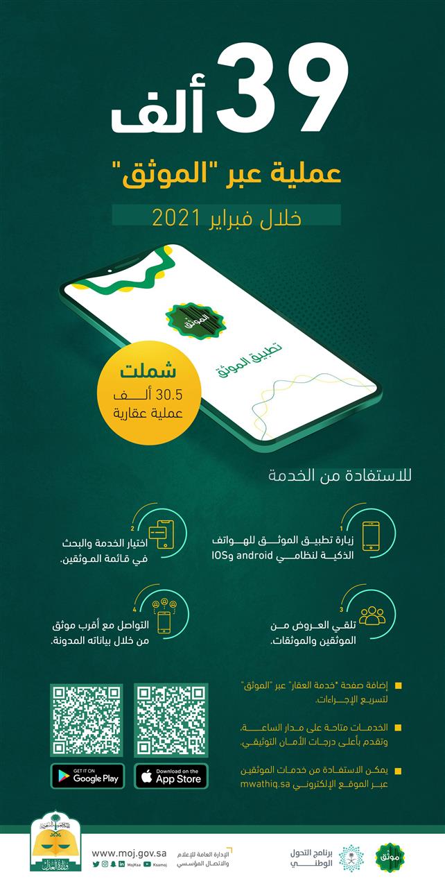 أجرت وزارة العدل أكثر من 39 ألف عملية توثيقية عبر خدمة الموثق خلال شهر فبراير من العام الجاري تنوعت بين مختلف الخدمات التي يقدمها الموثقون والموثقات.