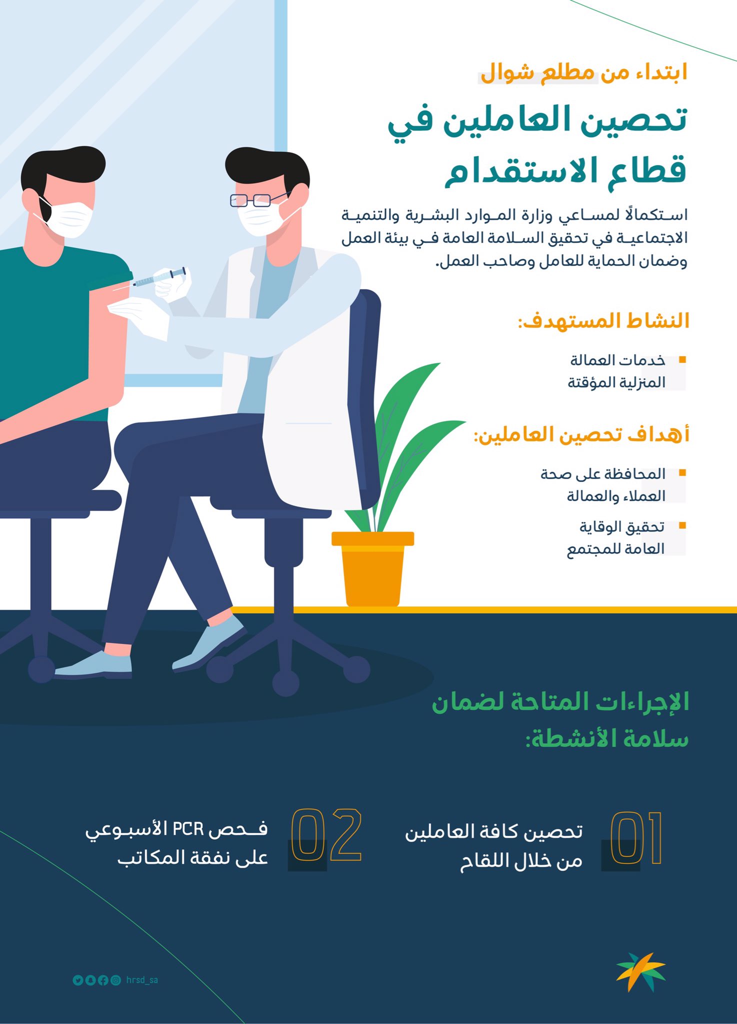 أصدرت وزارة الموارد البشرية والتنمية الاجتماعية تعميمًا لجميع مكاتب الاستقدام يقضي باشتراط تحصين جميع العاملين في مكاتب وشركات الاستقدام التي تمارس نشاط تأجير العمالة المنزلية لتقديم خدمات العمالة المنزلية المؤقتة ابتداء من 1 شوال 1442هـ الموافق 13 مايو 2021م، أو وجود نتيجة فحص “PCR” سلبية كل “7” أيام على نفقة المكتب للعاملين في هذه الأنشطة من غير المحصنين.