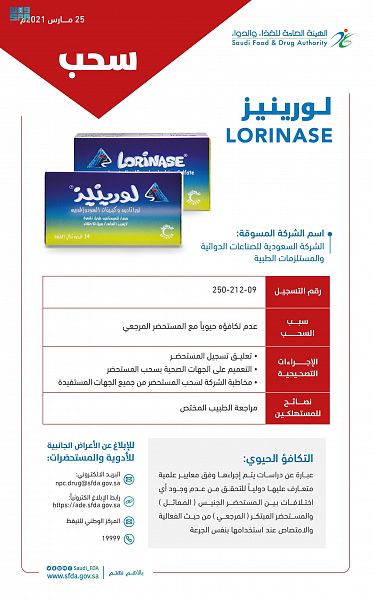 أصدرت الهيئة العامة للغذاء والدواء قرارا بتعليق تسجيل وسحب مستحضر( LORA S Tablet) المسجل بالهيئة برقم (8-968-15) ومستحضر (LORINASE TABLETS) المسجل بالهيئة برقم