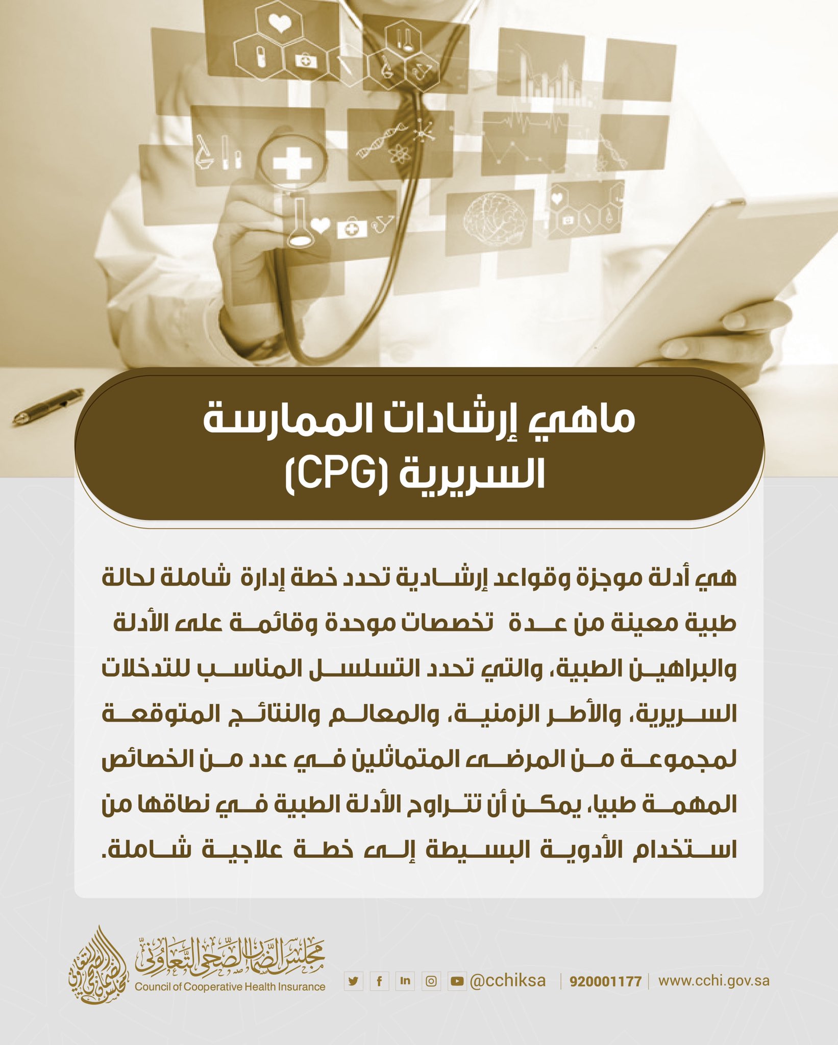 وتسعى الأمانة العامة لمجلس الضمان الصحي التعاوني من خلال إرشادات الممارسة السريرية الصحية إلى تحسين جودة الرعاية الصحية عبر تقليل التفاوت في الممارسة الطبية والحد من الأخطاء الطبية، بالإضافة إلى تعزيز رعاية المرضى المنظمة والفعالة، وتوحيد أنظمة العلاج وتسلسلها وتحسين النتائج مع التركيز على الدقة والشفافية.