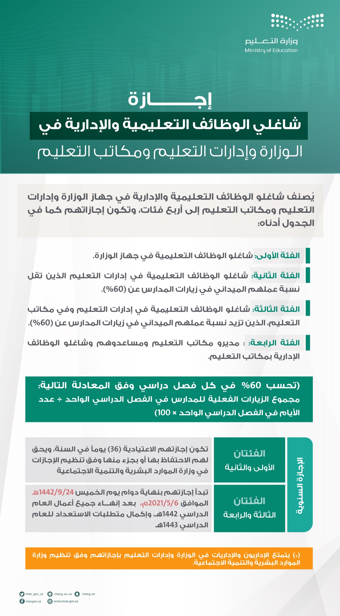 وشدد على أنه يجب إنهاء المناهج الدراسية في موعد أقصاه الخميس 26/8/1442هـ، ورصد درجات أعمال السنة للفصل الثاني في موعد أقصاه الاثنين 30/8/ 1442هـ، ورصد النتائج في نظام “نور” وإصدار إشعارات نتائج الطلاب يوم الخميس 10/9/1442هـ.
