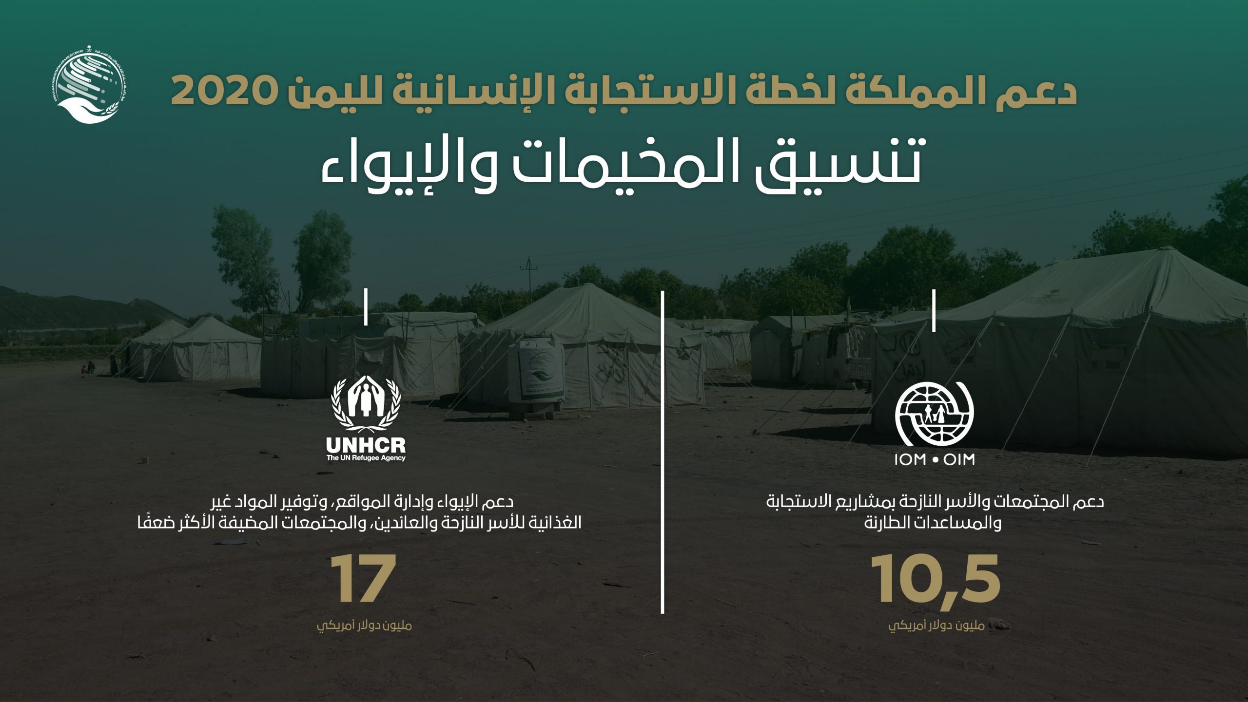 نفذ مركز الملك سلمان للإغاثة والأعمال الإنسانية ضمن منحة المملكة لخطة الاستجابة الإنسانية لليمن 2020م، العديد من المشاريع الإنسانية والإغاثية في تنسيق المخيمات وقطاع الإيواء.