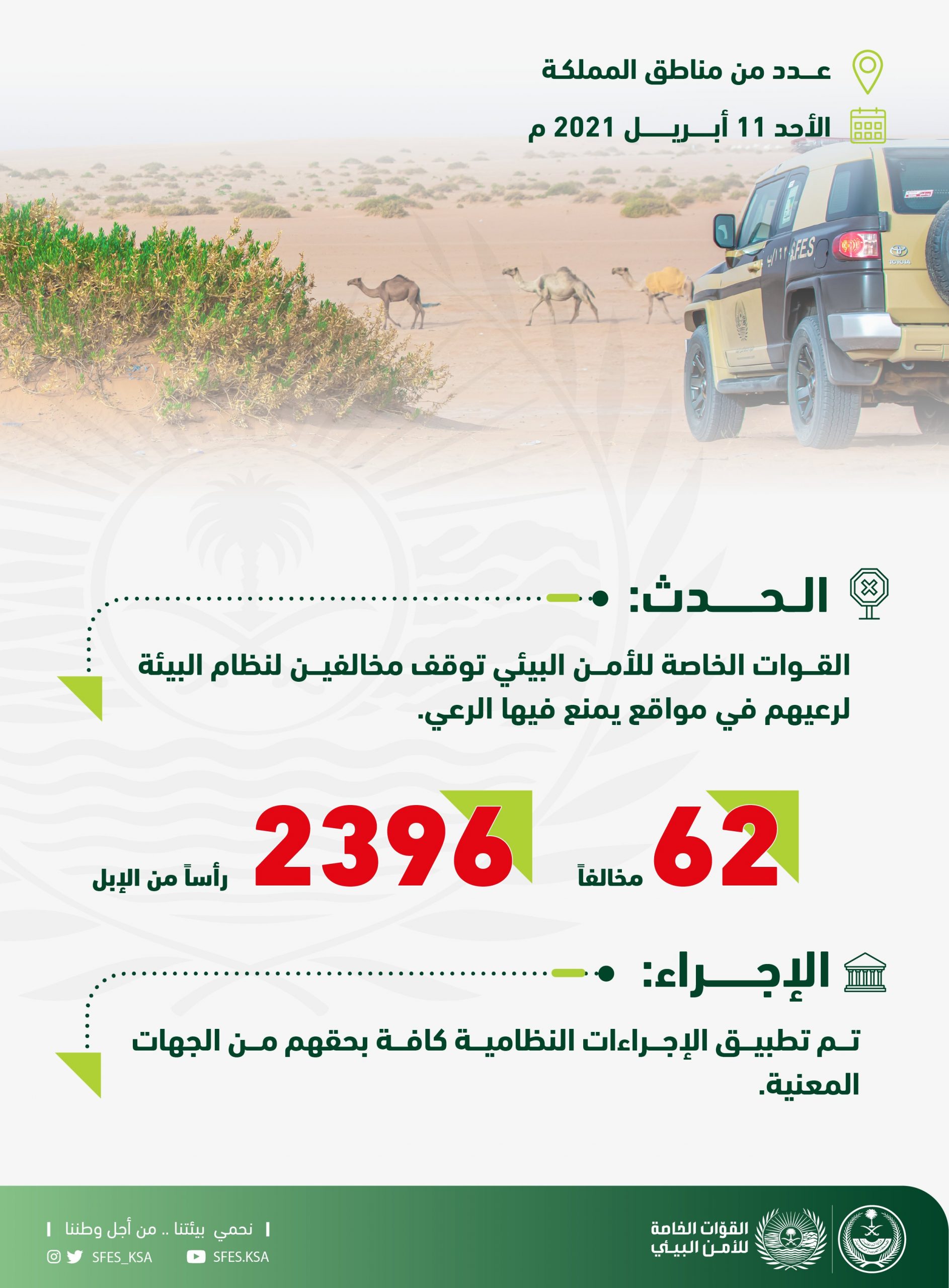 وأوضحت القوات الخاصة للأمن البيئي في رسم معلوماتي “إنفوجرافيك” ضمن تغريدة نشرتها على حسابها الرسمي بموقع “تويتر” أنه جرى إيقاف 62 مخالفاً لنظام البيئة يرعون 2396 رأس من الإبل في مواقع يمنع فيها الرعي بعدد من المناطق، مشيرة إلى أنه تم تطبيق كافة الإجراءات النظامية بحقهم من الجهات المعنية.