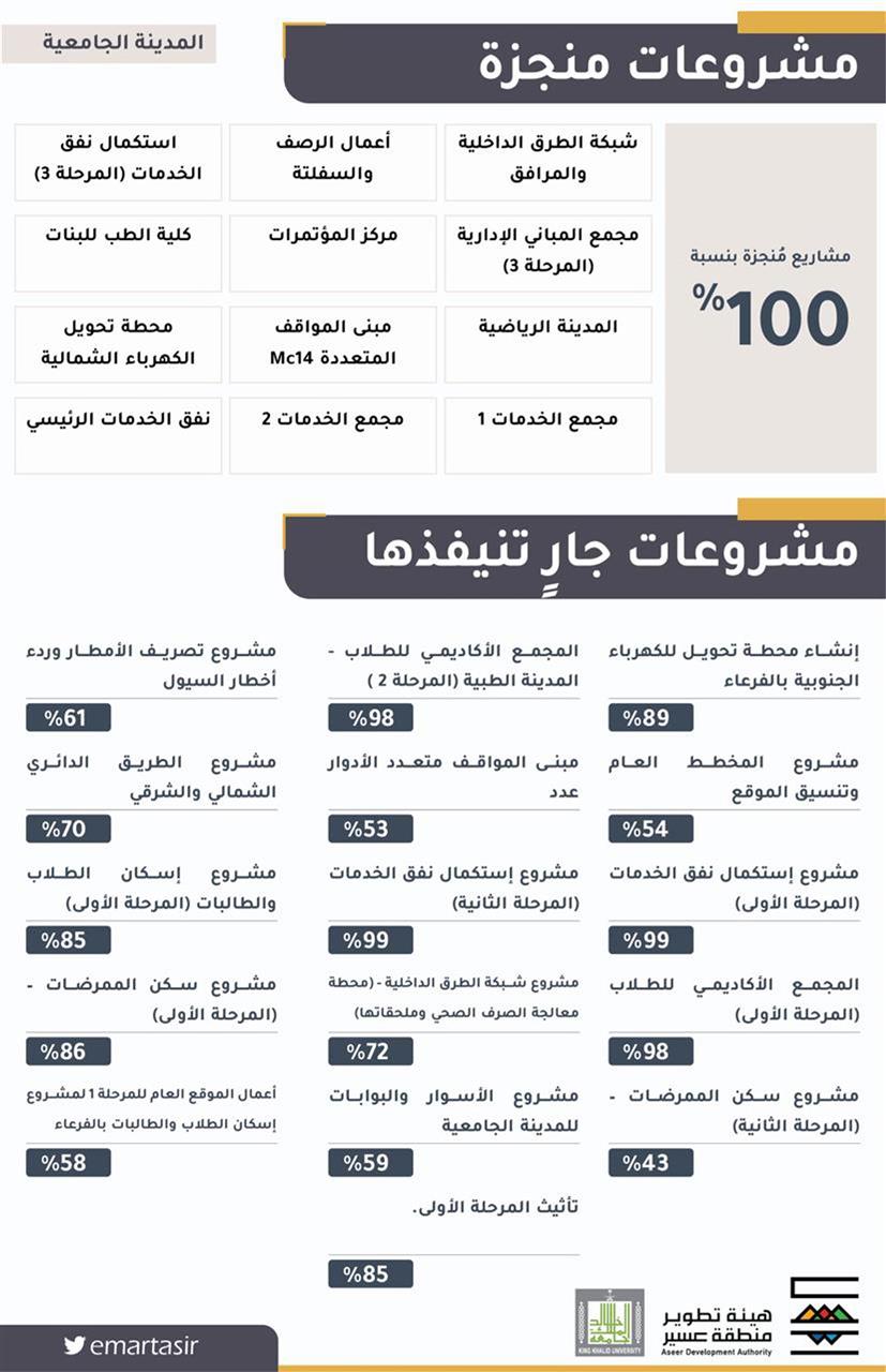 وجرى خلال الاجتماع مناقشة تحديد الأولويات في المشروعات المؤثرة على تشغيل المدينة الجامعية ومتابعة واستعراض المراحل المنجزة، مطلعًا سموه على 12 مشروعًا تم إنجازها بشكل كامل بتكلفة مالية تقدر بأكثر من ملياري ريال، وهي شبكة الطرق الداخلية والمرافق وأعمال الرصف والسفلتة، ونفق الخدمات (المرحلة 3)، ومجمع المباني الإدارية (المرحلة 3)، ومركز المؤتمرات وكلية الطب للبنات والمدينة الرياضية ومبنى المواقف المتعددة، ومحطة تحويل الكهرباء الشمالية، ومجمعي الخدمات 1 و2 ونفق الخدمات الرئيسي.