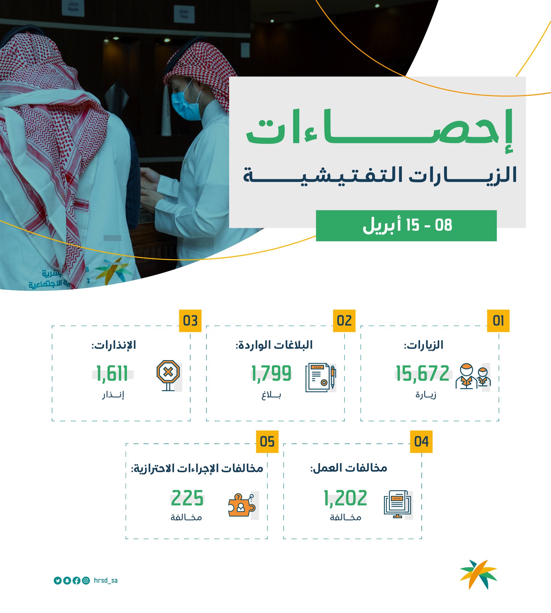 نفذت فرق الرقابة الميدانية بوزارة الموارد البشرية والتنمية الاجتماعية 15,672 زيارة رقابية على منشآت القطاع الخاص في مختلف مناطق المملكة، وذلك خلال الفترة من 08 إلى 15 أبريل، للتأكد من التزام أصحاب المنشآت بالقرارات والتشريعات الصادرة عن الوزارة لتنظيم سوق العمل وضبط المخالفات ومتابعة امتثال المنشآت للإجراءات الاحترازية والتوجيهات الصادرة في هذا الخصوص.