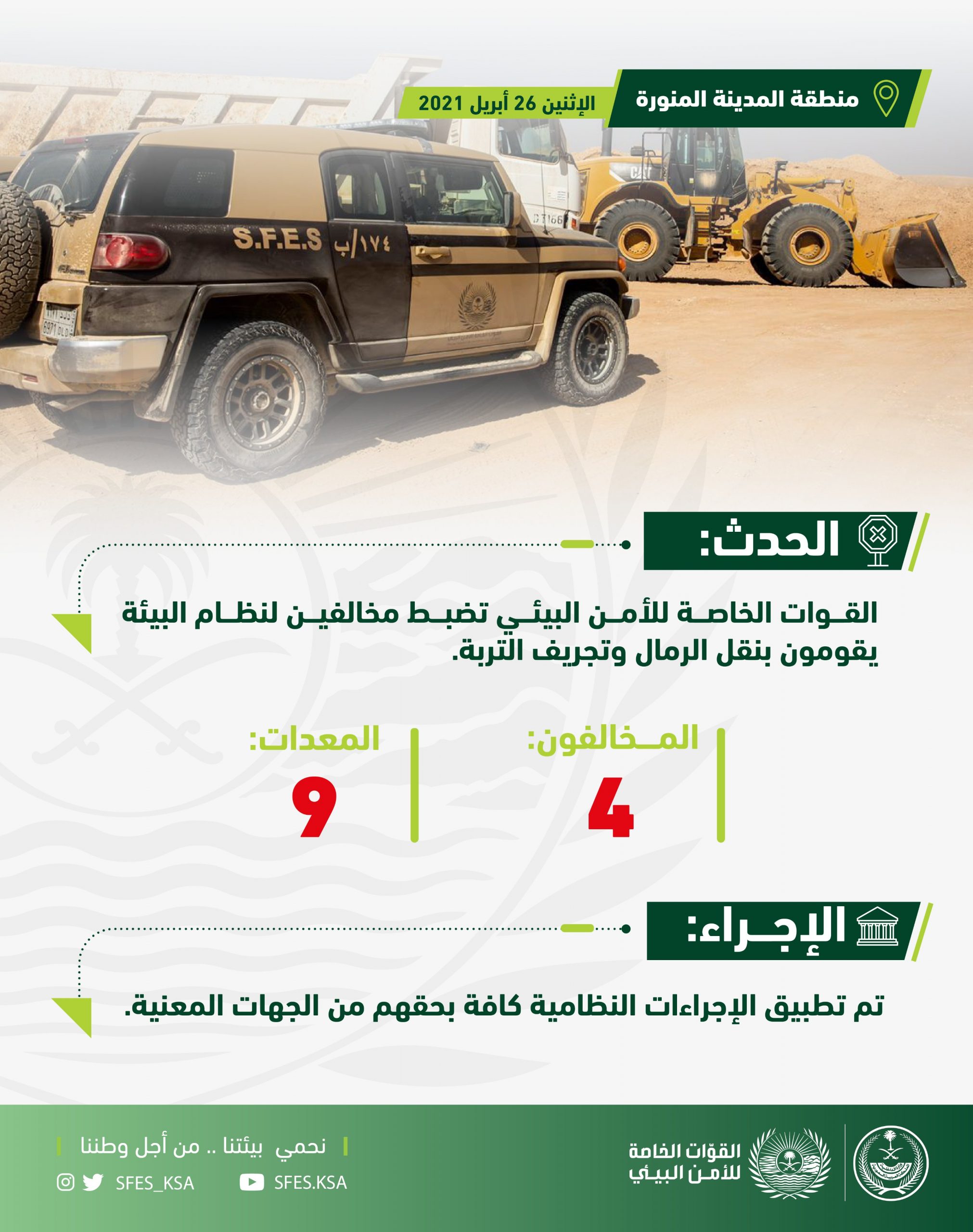 وأوضح المتحدث الرسمي للقوات الخاصة للأمن البيئي الرائد رائد المالكي، أنه تم ضبط “4” جرافات و”5″ شاحنات تستخدم في نقل الرمال وتجريف التربة، تعود ملكياتها لمواطن، ويعمل عليها مقيمون من الجنسيات الباكستانية والبنجلادشية وتم تطبيق الإجراءات النظامية كافة بحقهم من الجهات المعنية.
