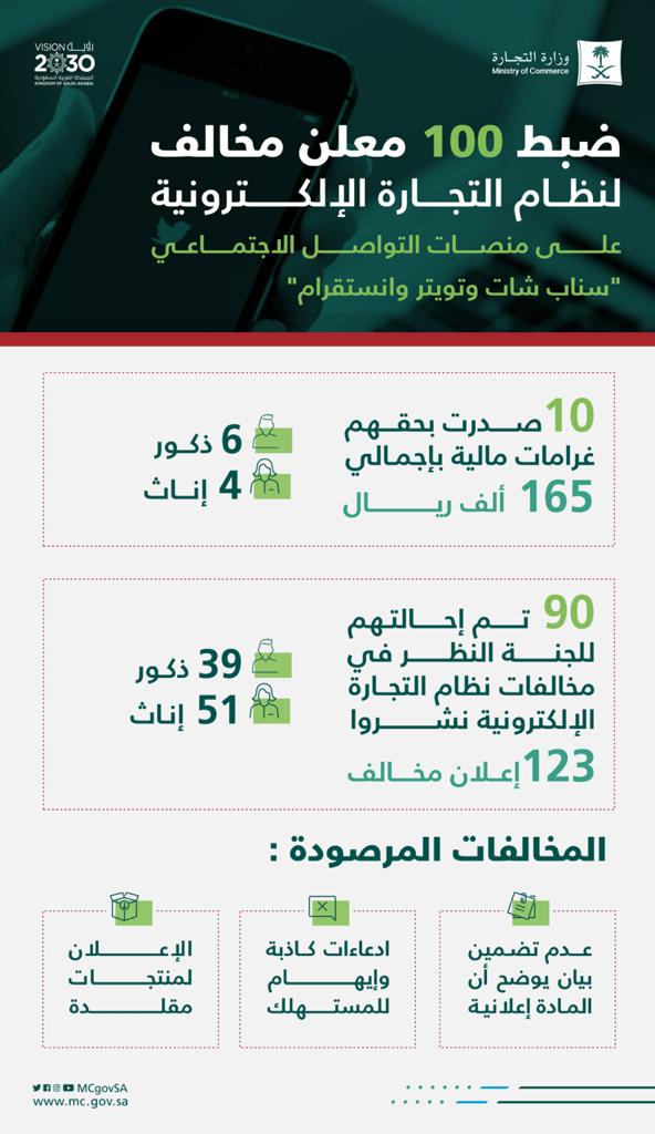 وأوقعت الوزارة غرامات مالية بقيمة 165 ألف ريال بحق 10 معلنين (6 ذكور، 4 إناث) عبر منصات التواصل الاجتماعي “سناب شات، تويتر، وإنستغرام”، حيث شملت المخالفات عدم كتابة عبارة إعلان، وإدعاءات كاذبة، وإعلان لمنتجات مقلدة.