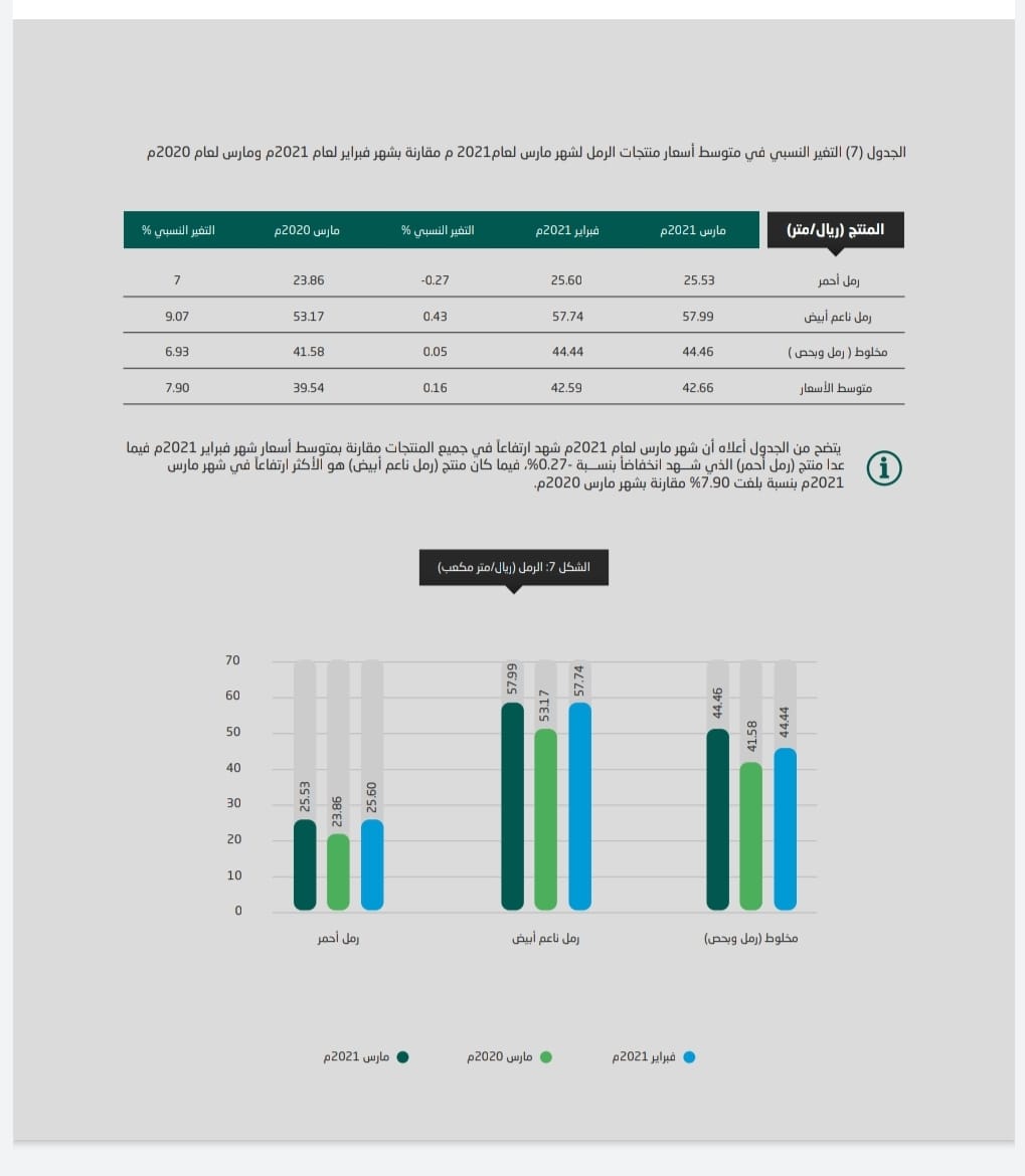 وﺷﻬﺪ ﻣﺘﻮﺳـــﻂ ﺃﺳﻌﺎﺭ ﻣﻨﺘﺞ ﺑﻼﻁ ﻛﺴـــﺮ ﺍﻟﺮﺧﺎﻡ ﺍﻧﺨﻔﺎﺿﺎً ﻓﻲ ﺷﻬﺮ ﻣـــﺎﺭﺱ 2021ﻡ ﺑﻨﺴـــﺒﺔ ﺑﻠﻐﺖ 0.04%، وﺍﻧﺨﻔﺾ ﻣﺘﻮﺳﻂ ﺳﻌﺮ ﻣﻨﺘﺞ ﺣﻠﻖ ﺍﻷﻟﻤﻨﻴـــﻮﻡ ﺑﻨﺴﺒﺔ ﺑﻠﻐﺖ 1.35%، في وقت أن ﻣﺘﻮﺳـــﻂ ﺳﻌﺮ ﻣﻨﺘﺞ ﺍﻟﺠﺒﺲ ﺷﻬﺪ ﺍﻧﺨﻔﺎﺿﺎً ﺑﻨﺴـــﺒﺔ ﺑﻠﻐـــﺖ 0.07% ﻣﻘﺎﺭﻧﺔ ﺑﺸﻬﺮ فبراير 2021ﻡ.