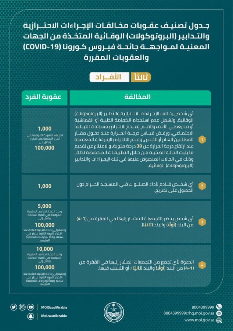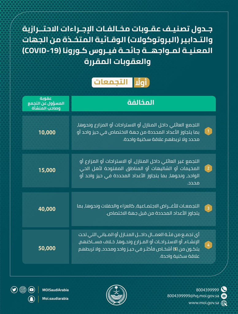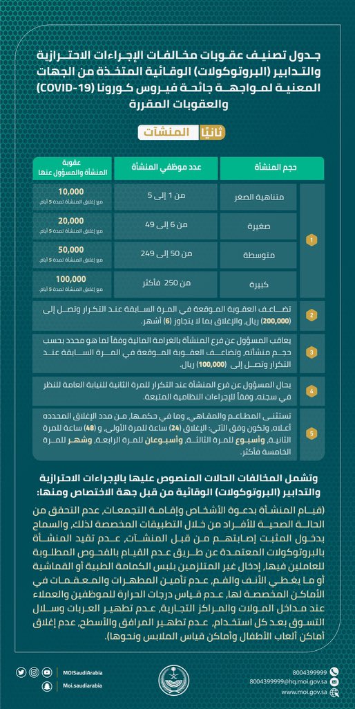 1- “1000” ريال، وتضاعف العقوبة الموقعة في المرة السابقة عند التكرار وتصل إلى “100.000” ريال لأي شخص يخالف الإجراءات الاحترازية والتدابير “البروتوكولات” الوقائية بـ “عدم استخدام الكمامة الطبية أو القماشية أو ما يغطي الأنف والفم، عدم الالتزام بمسافات التباعد الاجتماعي، رفض قياس درجة الحرارة عند دخول مقار القطاعين العام أو الخاص، عدم الالتزام بالإجراءات المعتمدة عند ارتفاع درجة الحرارة عن 38 درجة مئوية، الامتناع عن تقديم ما يثبت الحالة الصحية من خلال التطبيقات المخصصة لذلك”، وذلك في الحالات المنصوص عليها في تلك الإجراءات والتدابير “البروتوكولات” الوقائية.