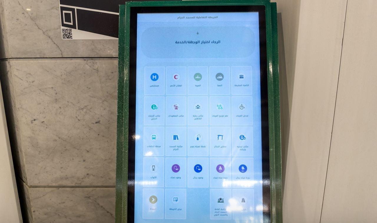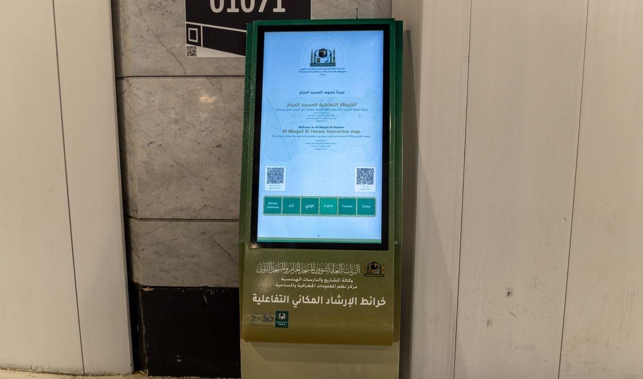 وفرت الرئاسة العامة لشؤون المسجد الحرام والمسجد النبوي ممثلةً بوكالة المشاريع والدراسات الهندسية، الشاشة التفاعلية الخاصة بعرض خرائط الإرشاد المكاني للمسجد الحرام وساحاته ومرافقه، ضمن خطة الوكالة في تطوير ورفع جودة النظام الإرشادي للمسجد الحرام.