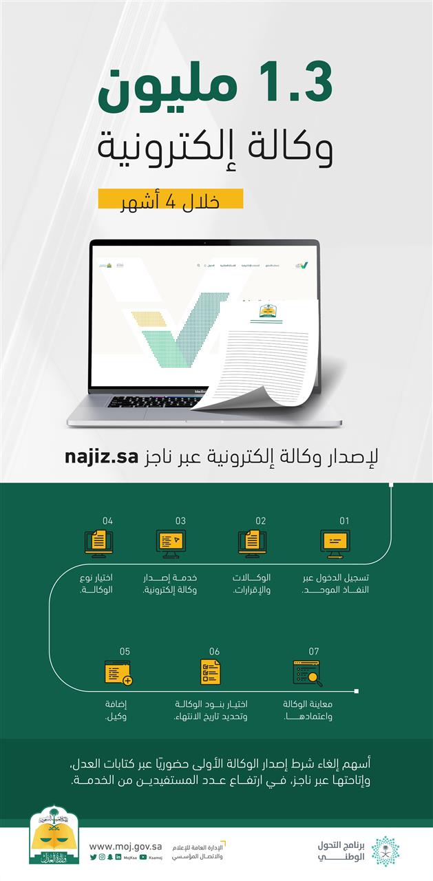 كشفت وزارة العدل، عن إصدار 1.3 مليون وكالة إلكترونية، خلال 4 أشهر، عبر بوابة ناجز وأكدت الوزارة، أن توجيه معالي وزير العدل الدكتور وليد بن محمد الصمعاني، مؤخرًا، بإلغاء شرط إصدار الوكالة الأولى حضوريًا عبر كتابات العدل، وإتاحتها من خلال بوابة ناجز الإلكترونية najiz.sa أسهم في ارتفاع عدد المستفيدين من الخدمة.