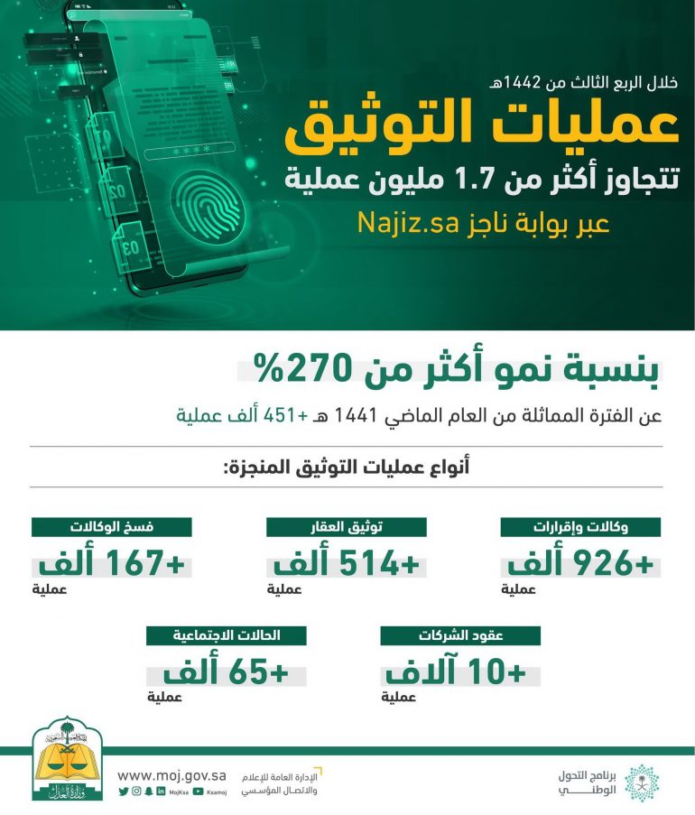 كشفت وزارة العدل عن إجراء نحو 1.7 مليون عملية توثيق إلكترونيًا، خلال الربع الثالث من العام الهجري الجاري 1442 هـ وأكدت وزارة العدل، إتاحة خدماتها التوثيقية إلكترونيًا عبر بوابة ناجز Najiz.sa، دون الحاجة إلى زيارة المستفيدين لكتابة العدل، بهدف تيسير الإجراءات عليهم، ورفع كفاءة العمل والأداء.