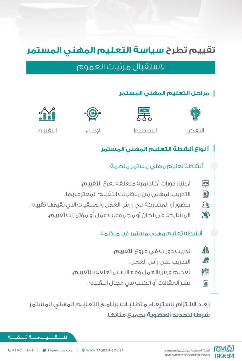 طرحت الهيئة السعودية للمقيمين المعتمدين “تقييم” اليوم، سياسة التعليم المهني المستمر التي تعنى بِحث أعضاء تقييم الحاصلين على الزمالة على تطوير وتحسين مهاراتهم باستمرار مما سيسهم في تقديم خدمات ذات جودة عالية لعملاء التقييم، وذلك انطلاقًا من حرص الهيئة على تطوير مهارات أعضائها وإشراك المتخصصين في وضع السياسات واللوائح المتعلقة بتنظيم وتطوير المهنة.