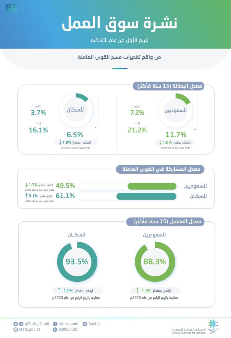 أصدرت الهيئة العامة للإحصاء “GASTAT”، نشرة سوق العمل للربع الأول من عام 2021م، وذلك وفقًا لتقديرات مسح القوى العاملة الذي تُجْريه الهيئة بشكل ربع سنوي، حيث أظهرت النتائج انخفاض معدل بطالة إجمالي السكان السعوديين وغير السعوديين “15سنة فأكثر” من واقع تقديرات مسح القوى العاملة للربع الأول من عام 2021م لتصل إلى “6.5%” مقارنةً بـ “7.4%” خلال الربع السابق “الربع الرابع من عام 2020م”، فيما انخفض معدل البطالة لإجمالي السعوديين “الذكور والإناث 15سنة فأكثر” إذ بلغ “11.7%” في الربع الأول من عام 2021م، مقارنةً بـ “12.6%” خلال الربع السابق.