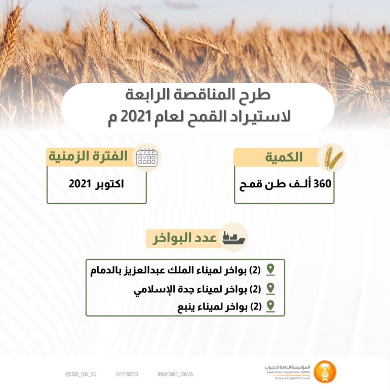 أعلنت المؤسسة العامة للحبوب اليوم، عن طرح المناقصة الرابعة لهذا العام لاستيراد كمية “360” ألف طن قمح للتوريد خلال شهر أكتوبر 2021.