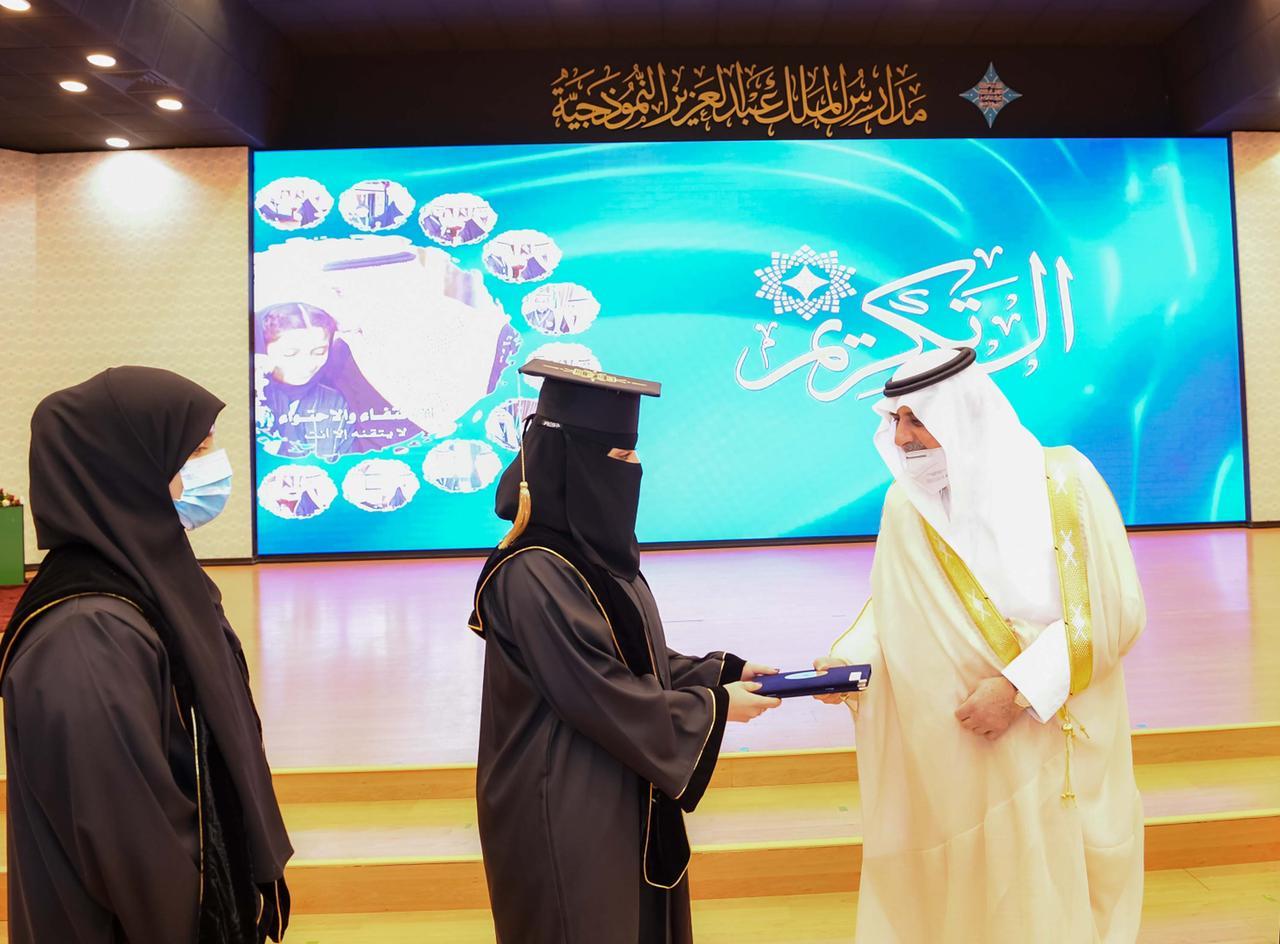 ثم شاهد سموه والحضور عرضاً مرئياً استعرض من خلاله إنجازات المدارس وخصوصاً خلال فترة جائحة كورونا, كما شاهد سموه عرض مرئي لمسيرة الخريجين، بعدها كرّم سمو أمير المنطقة الطلاب والطالبات المتفوقين بالمدارس.