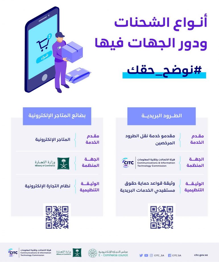 أطلقت هيئة الاتصالات وتقنية المعلومات حملةً توعوية بالتعاون مع وزارة التجارة لتوضيح حقوق مستفيدي الخدمات البريدية المتعلقة بالتجارة الإلكترونية؛ بهدف رفع مستوى الوعي بهذه الحقوق وأدوار جميع الجهات المعنية بتنظيم عمليات التجارة الإلكترونية في المملكة.